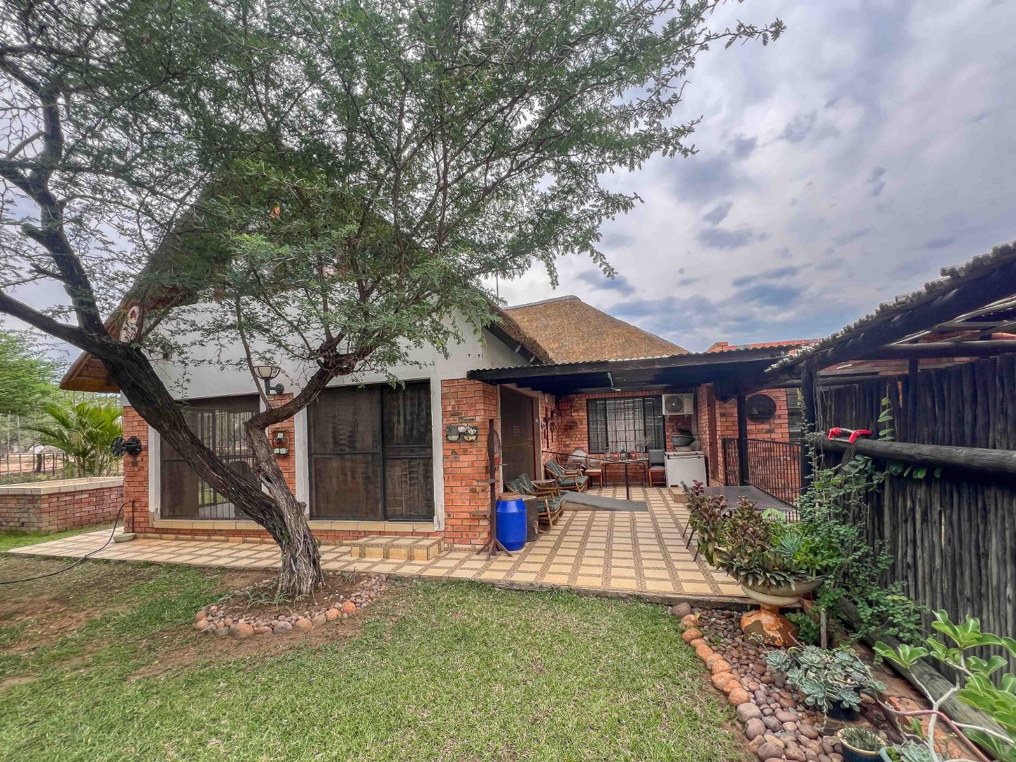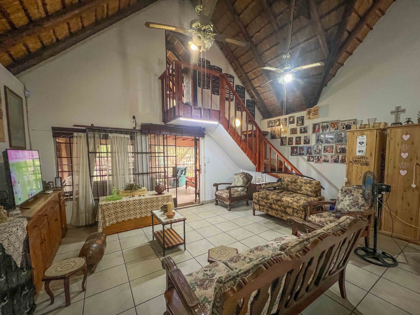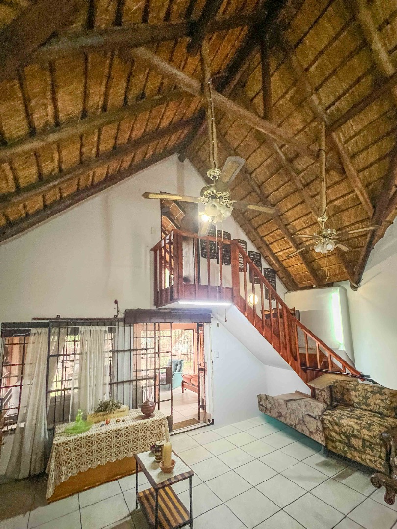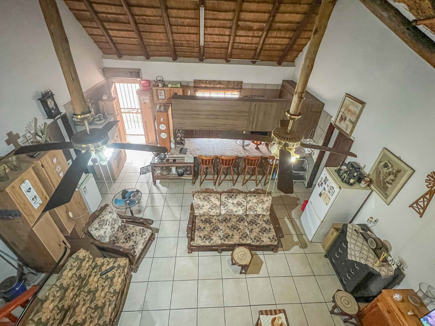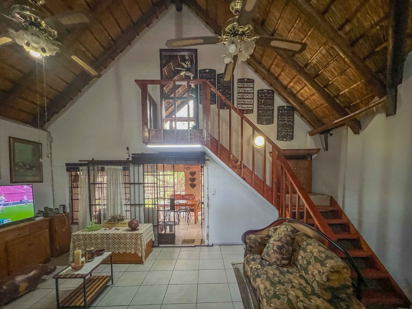 Experience unique wildlife estate living in Marloth Park with this charming 3-bedroom, 2-bathroom home. Spanning a 2000 sqm erf, the property showcases a rustic aesthetic with durable brick construction and a distinctive thatched roof featuring exposed wooden beams. The interior offers an inviting open-plan living space with high vaulted ceilings and tiled flooring, alongside a dedicated family TV room and a functional kitchen. A versatile mezzanine level/loft, complete with hardwood floors, provides additional flexible space.