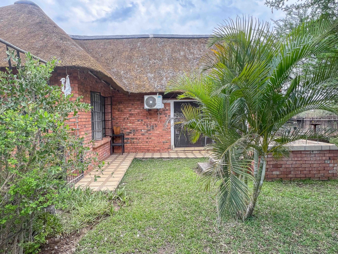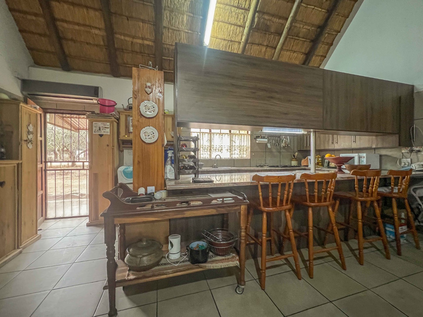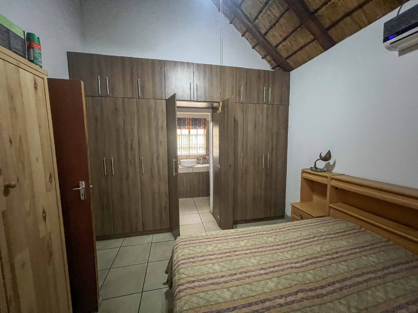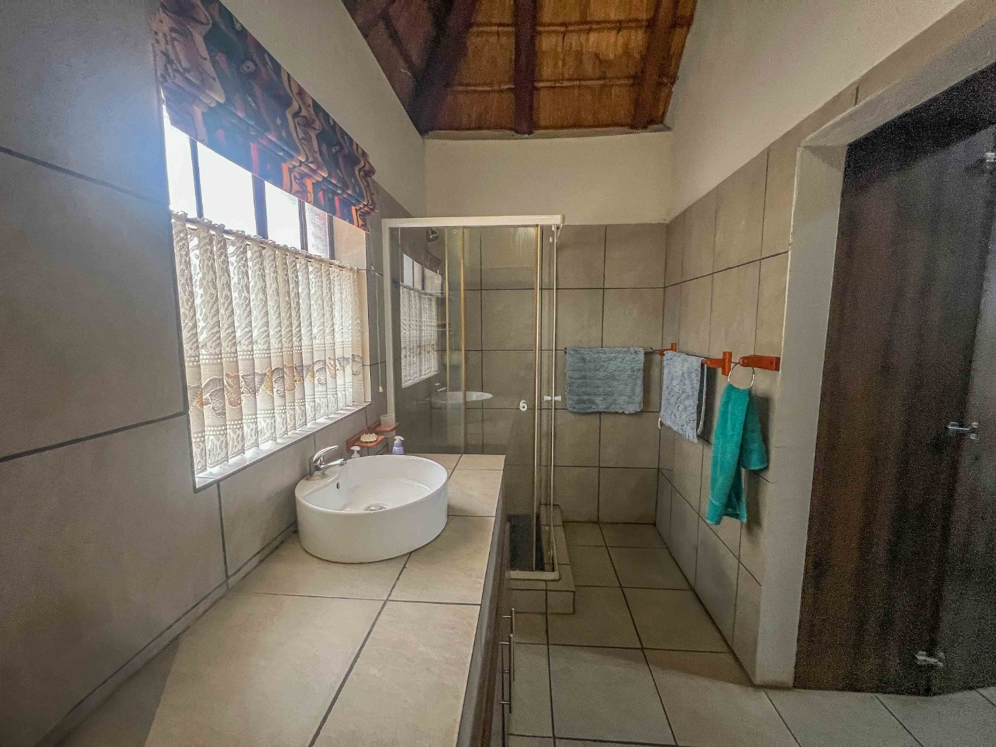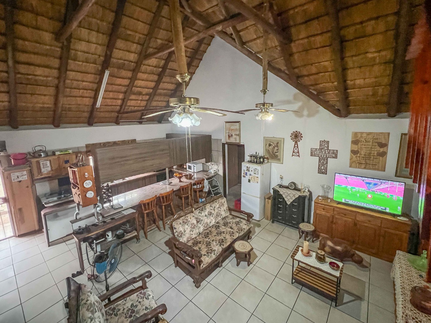 Experience unique wildlife estate living in Marloth Park with this charming 3-bedroom, 2-bathroom home. Spanning a 2000 sqm erf, the property showcases a rustic aesthetic with durable brick construction and a distinctive thatched roof featuring exposed wooden beams. The interior offers an inviting open-plan living space with high vaulted ceilings and tiled flooring, alongside a dedicated family TV room and a functional kitchen. A versatile mezzanine level/loft, complete with hardwood floors, provides additional flexible space.