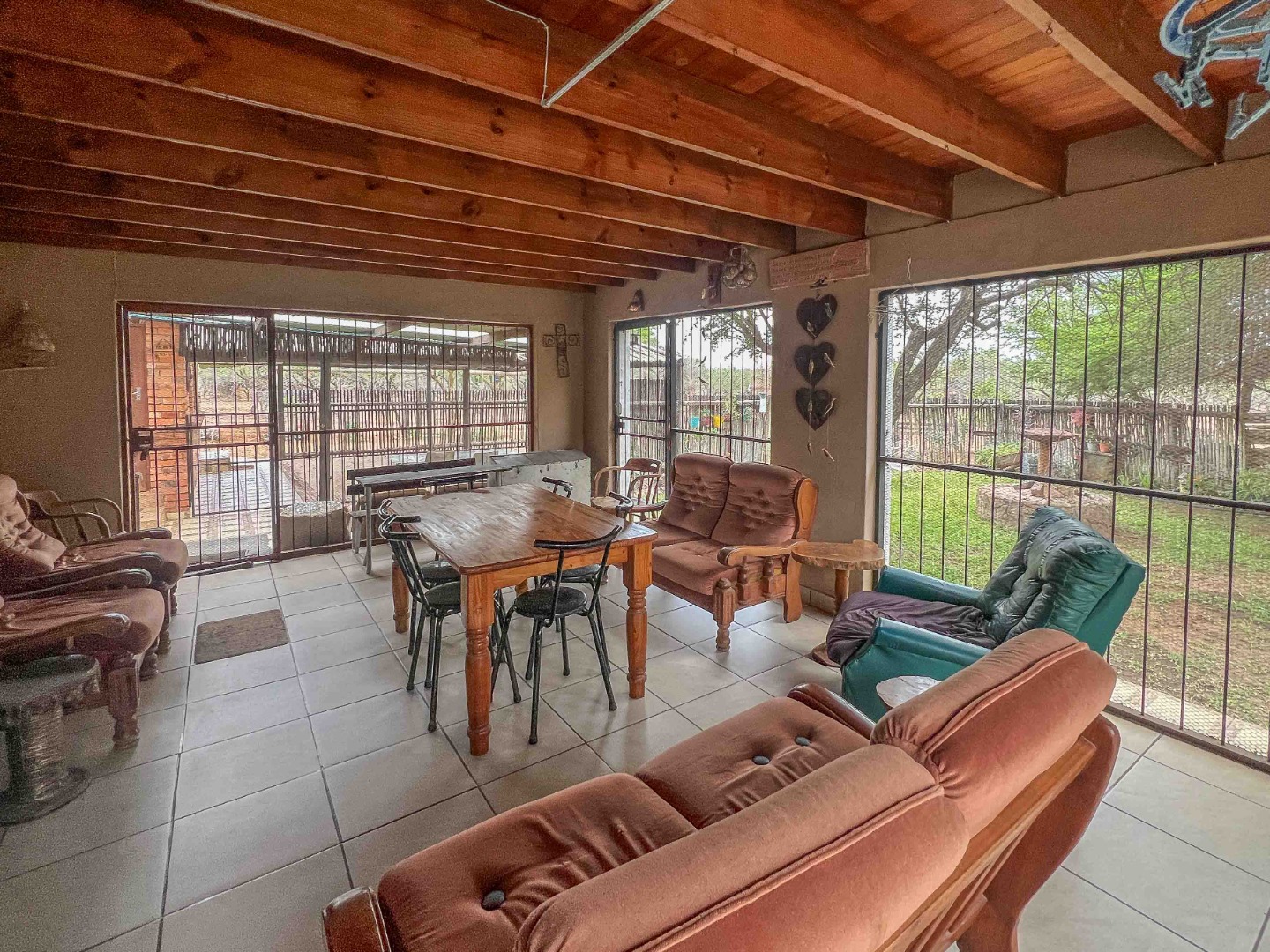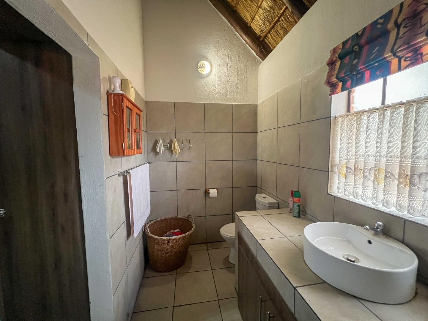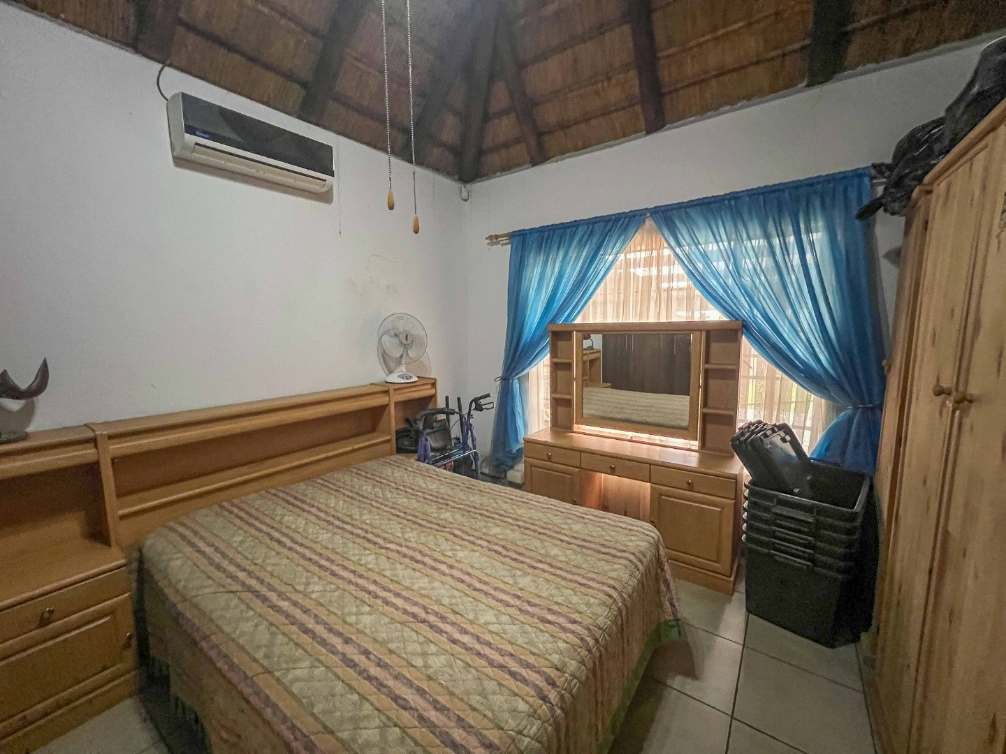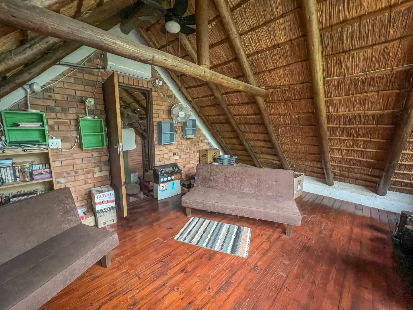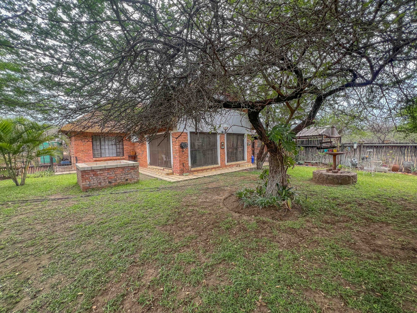 Experience unique wildlife estate living in Marloth Park with this charming 3-bedroom, 2-bathroom home. Spanning a 2000 sqm erf, the property showcases a rustic aesthetic with durable brick construction and a distinctive thatched roof featuring exposed wooden beams. The interior offers an inviting open-plan living space with high vaulted ceilings and tiled flooring, alongside a dedicated family TV room and a functional kitchen. A versatile mezzanine level/loft, complete with hardwood floors, provides additional flexible space.
