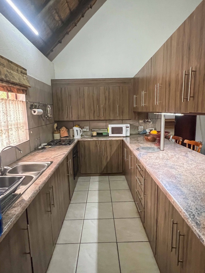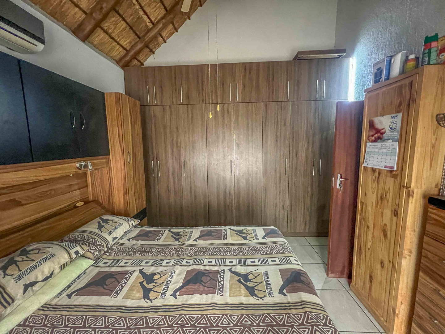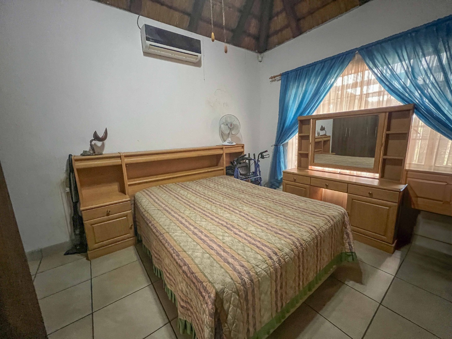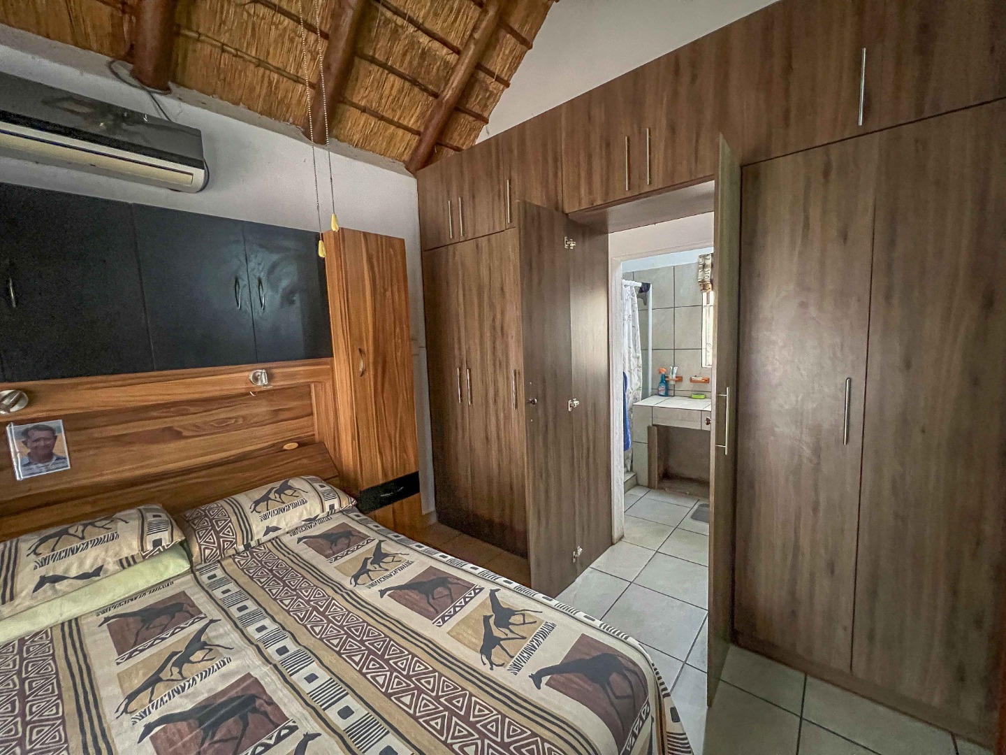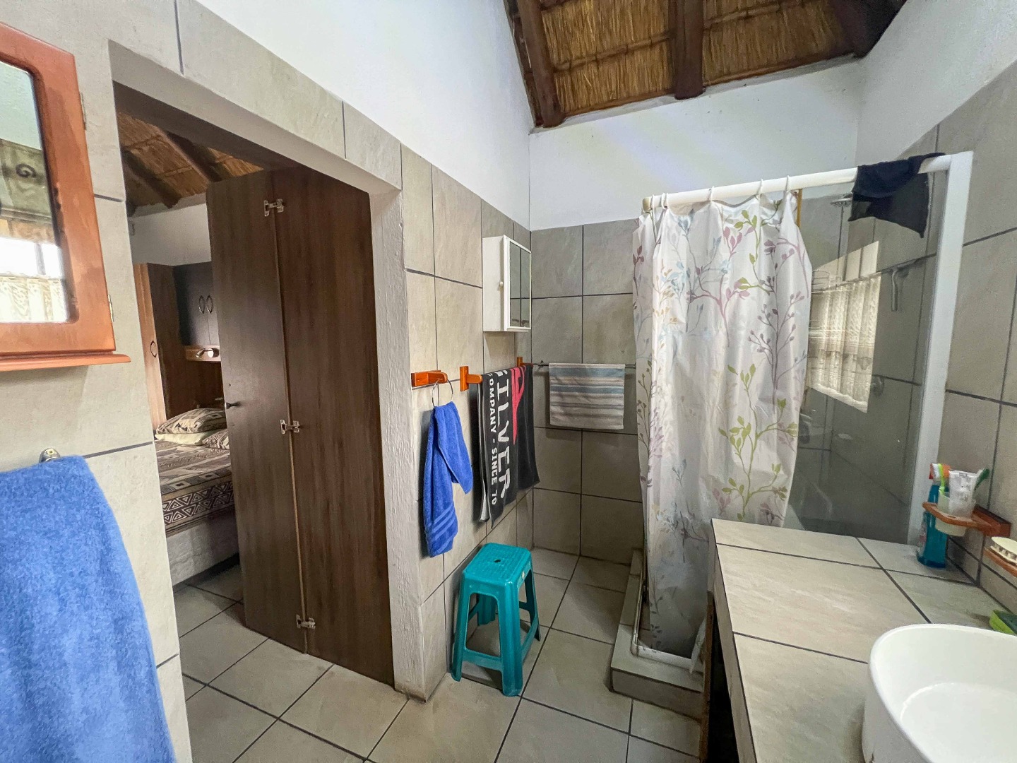 Experience unique wildlife estate living in Marloth Park with this charming 3-bedroom, 2-bathroom home. Spanning a 2000 sqm erf, the property showcases a rustic aesthetic with durable brick construction and a distinctive thatched roof featuring exposed wooden beams. The interior offers an inviting open-plan living space with high vaulted ceilings and tiled flooring, alongside a dedicated family TV room and a functional kitchen. A versatile mezzanine level/loft, complete with hardwood floors, provides additional flexible space.