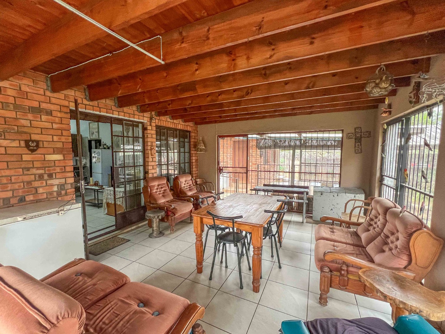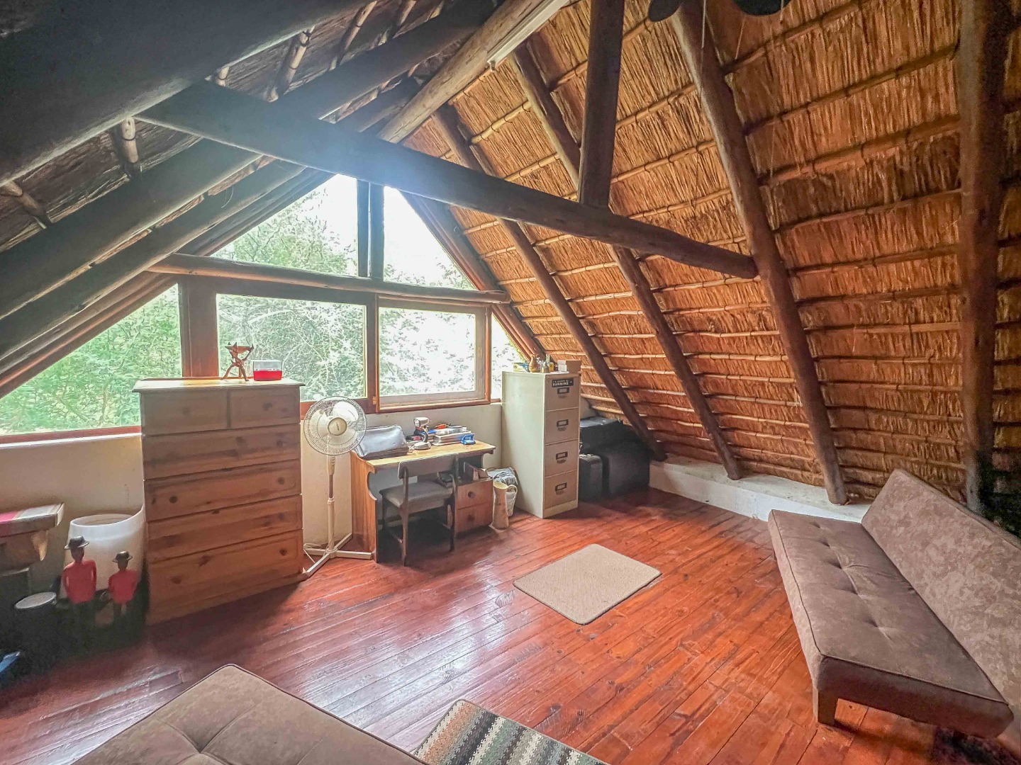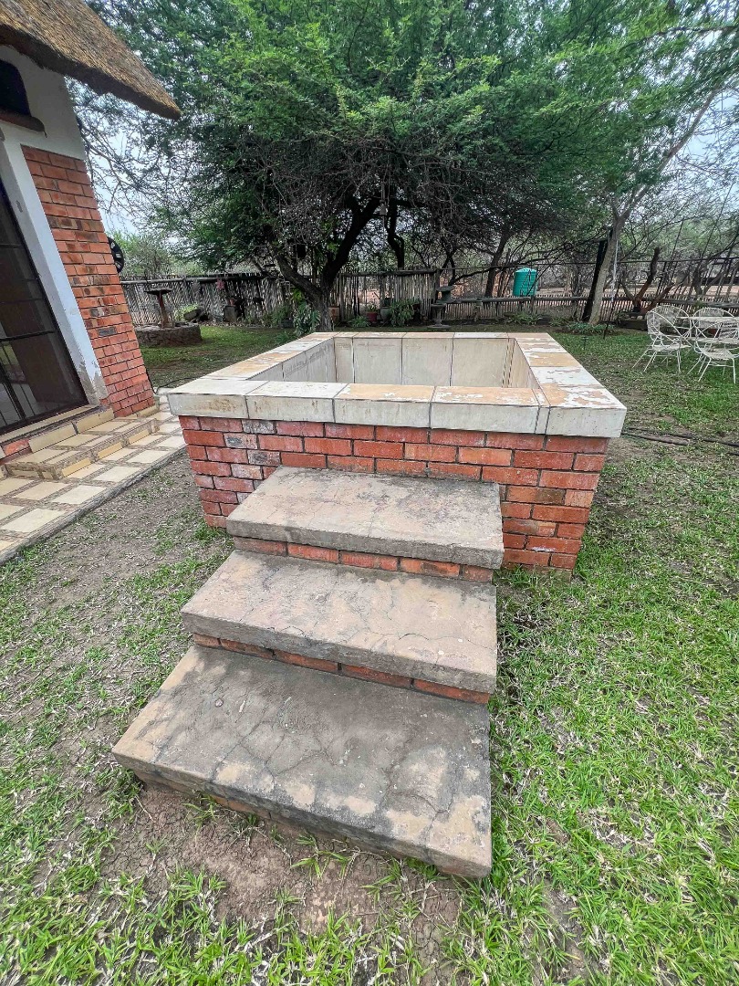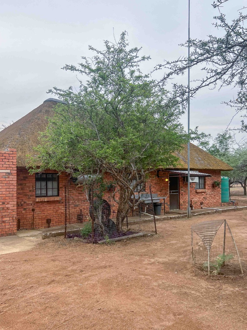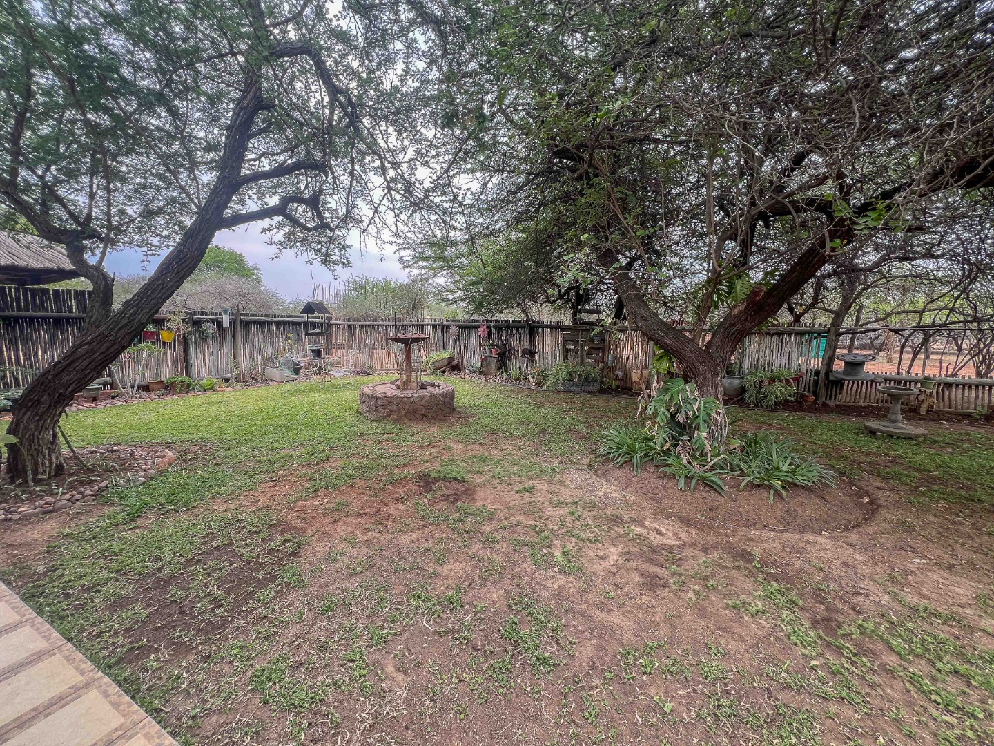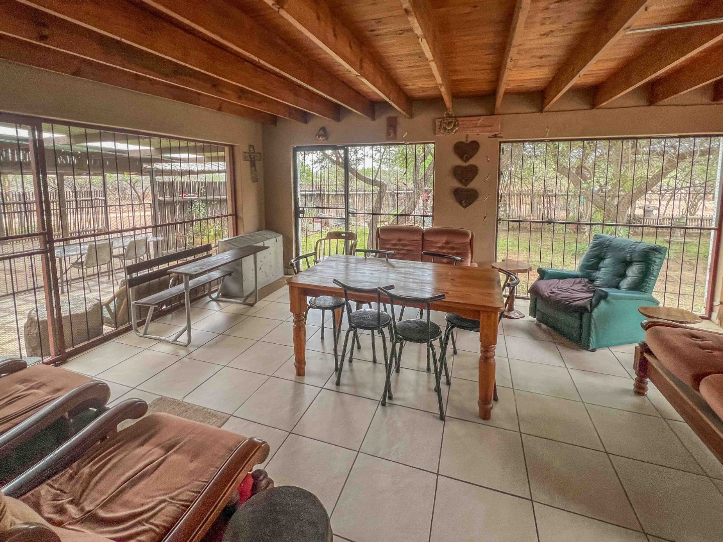 Experience unique wildlife estate living in Marloth Park with this charming 3-bedroom, 2-bathroom home. Spanning a 2000 sqm erf, the property showcases a rustic aesthetic with durable brick construction and a distinctive thatched roof featuring exposed wooden beams. The interior offers an inviting open-plan living space with high vaulted ceilings and tiled flooring, alongside a dedicated family TV room and a functional kitchen. A versatile mezzanine level/loft, complete with hardwood floors, provides additional flexible space.