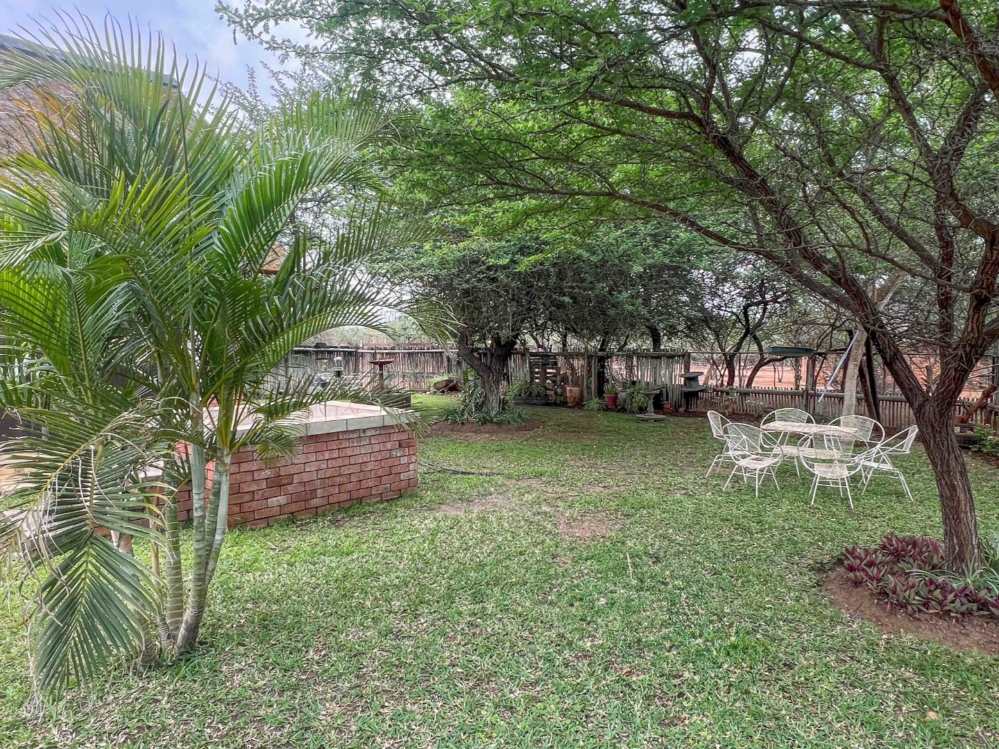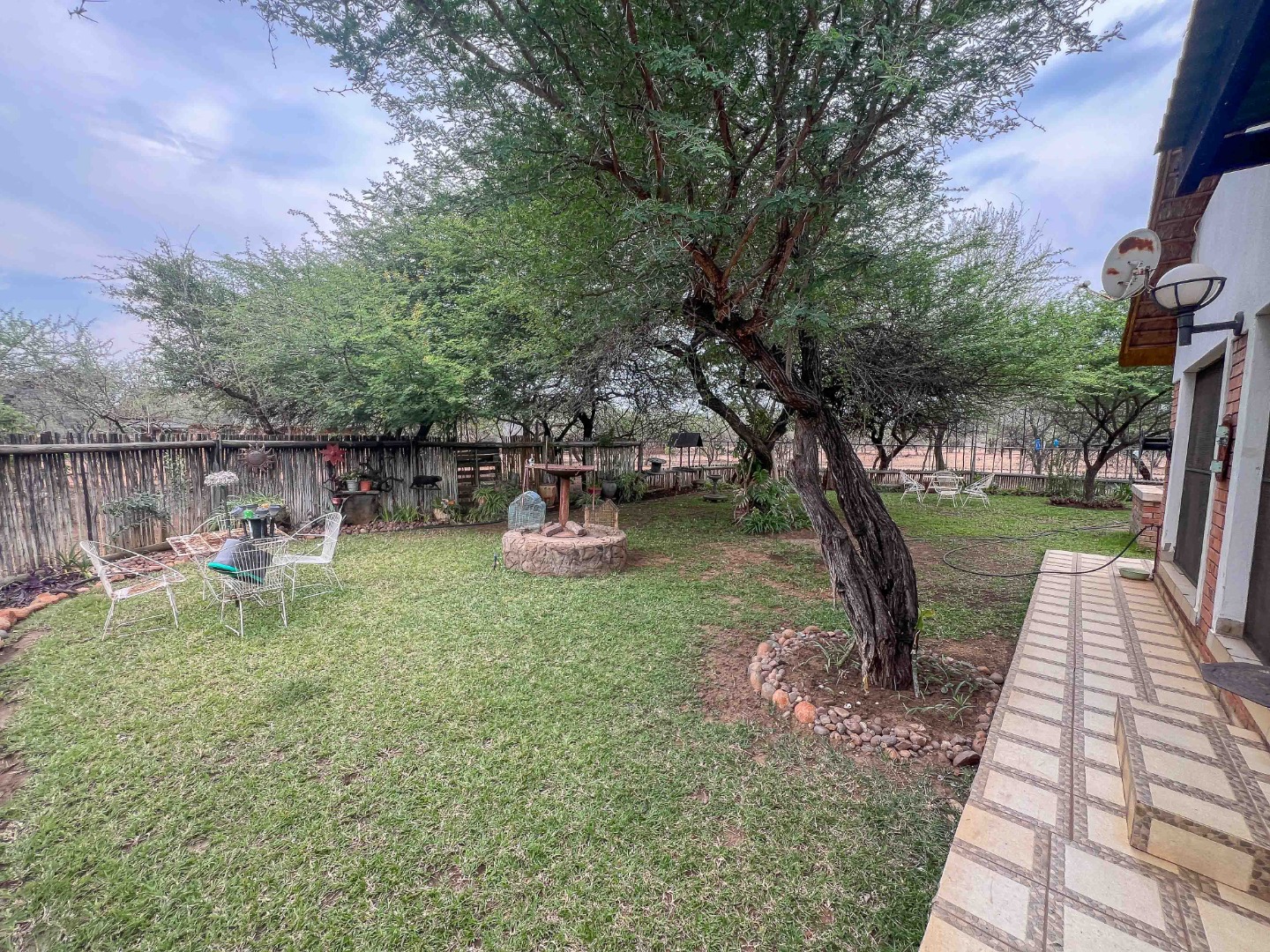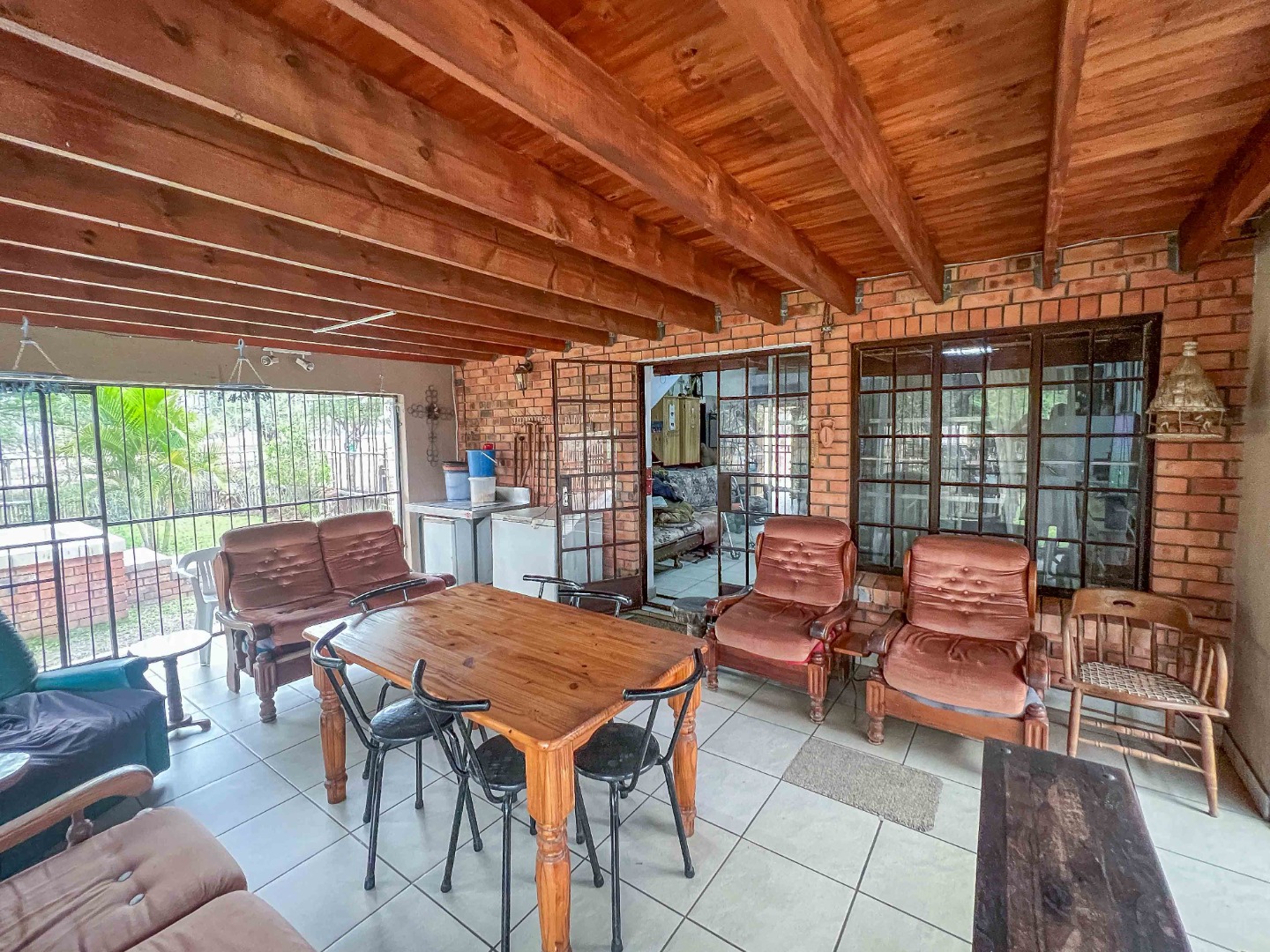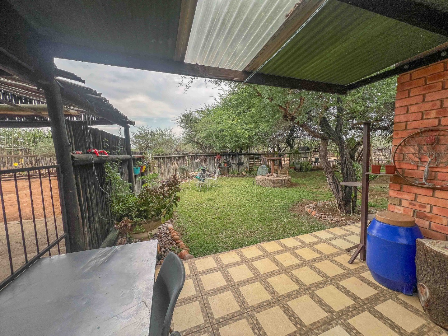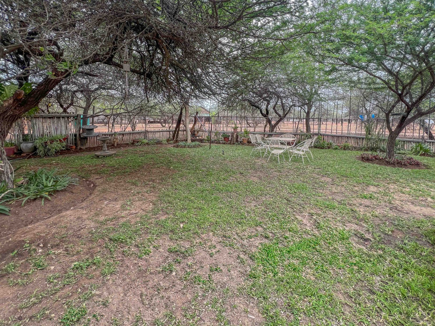 Experience unique wildlife estate living in Marloth Park with this charming 3-bedroom, 2-bathroom home. Spanning a 2000 sqm erf, the property showcases a rustic aesthetic with durable brick construction and a distinctive thatched roof featuring exposed wooden beams. The interior offers an inviting open-plan living space with high vaulted ceilings and tiled flooring, alongside a dedicated family TV room and a functional kitchen. A versatile mezzanine level/loft, complete with hardwood floors, provides additional flexible space.