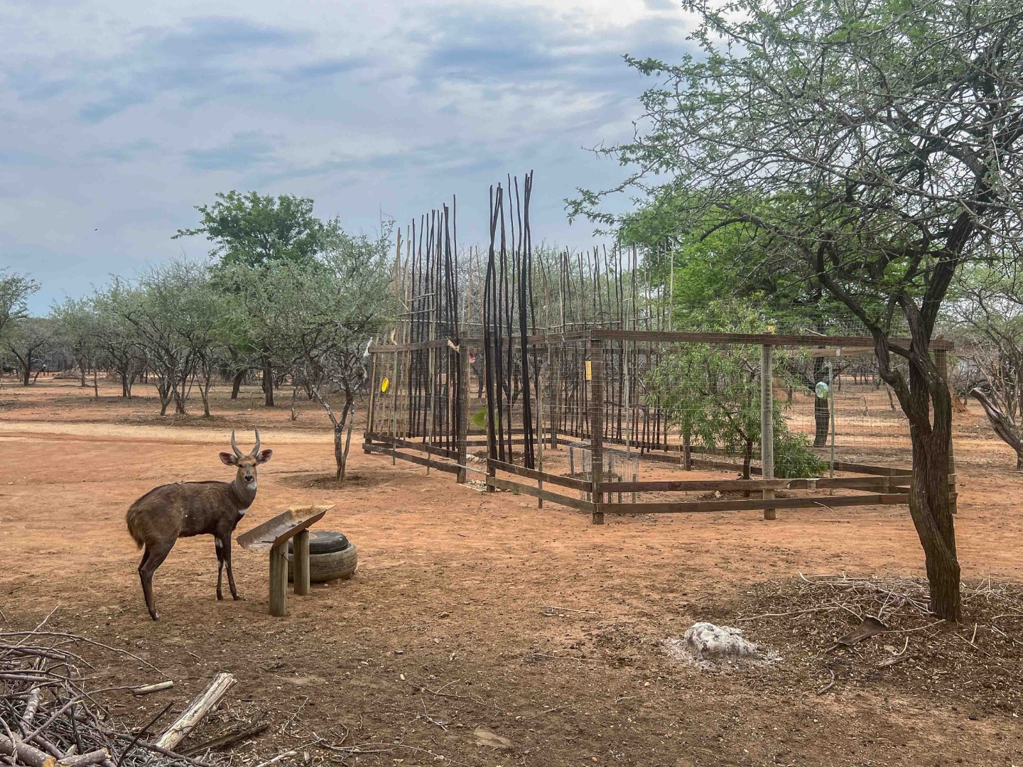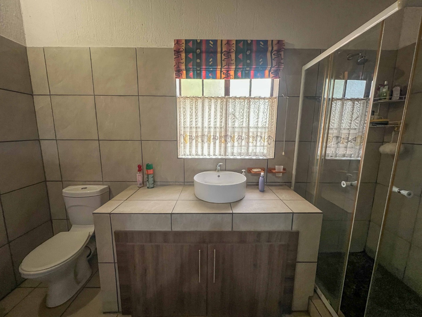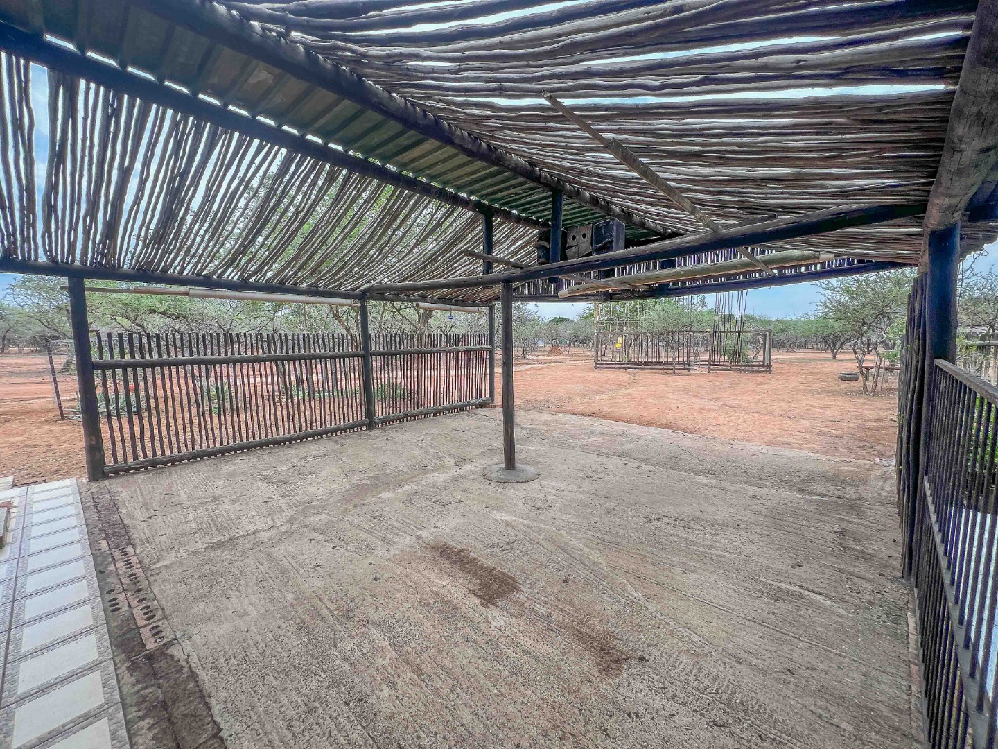 Outdoor living is enhanced by a spacious covered patio with tiled flooring and an accessibility ramp, ideal for entertaining. The property includes a refreshing swimming pool, a garden, and two garages. Practical features like a borehole ensure water resilience, complemented by outside toilets. Located in Marloth Park, this home offers unparalleled proximity to nature.