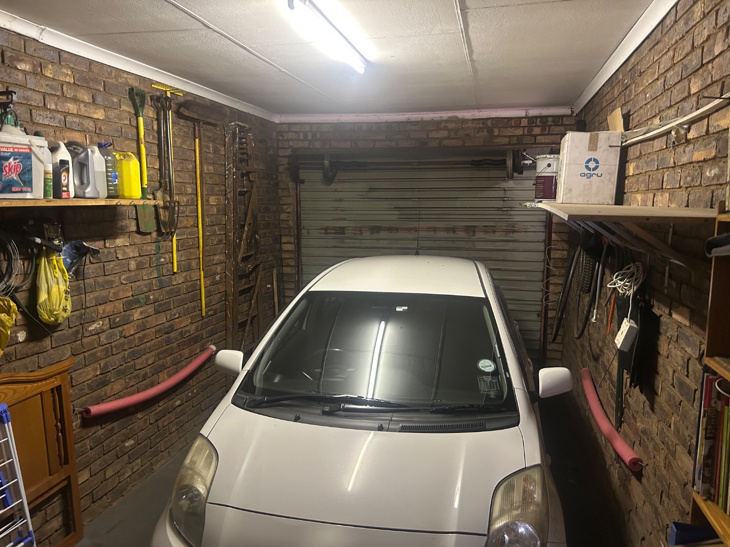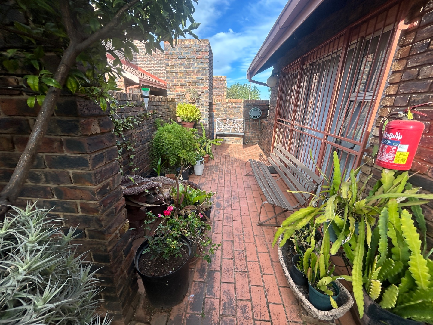 The property boasts a single garage with electric remote garage door and an additional carport, providing secure parking options. The compact 117 sqm erf size is efficiently utilized, featuring a well-kept garden with an irrigation system and durable paving throughout the exterior, including outside toilet for added practicality.