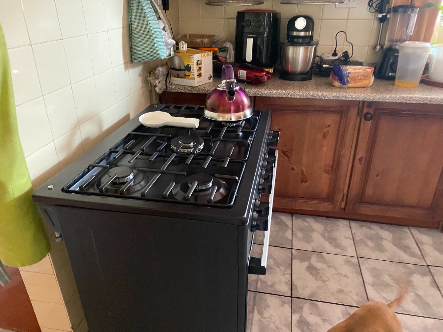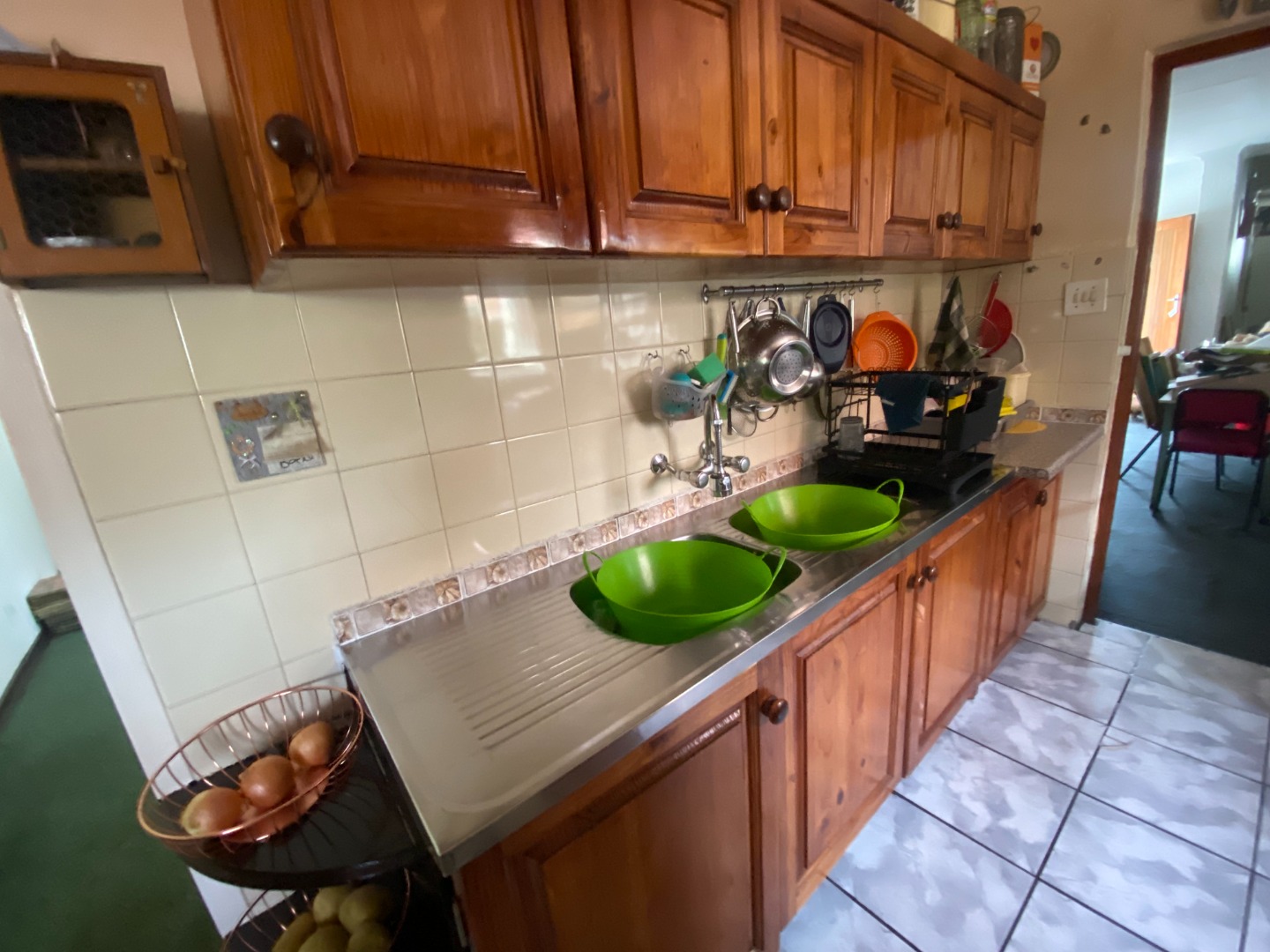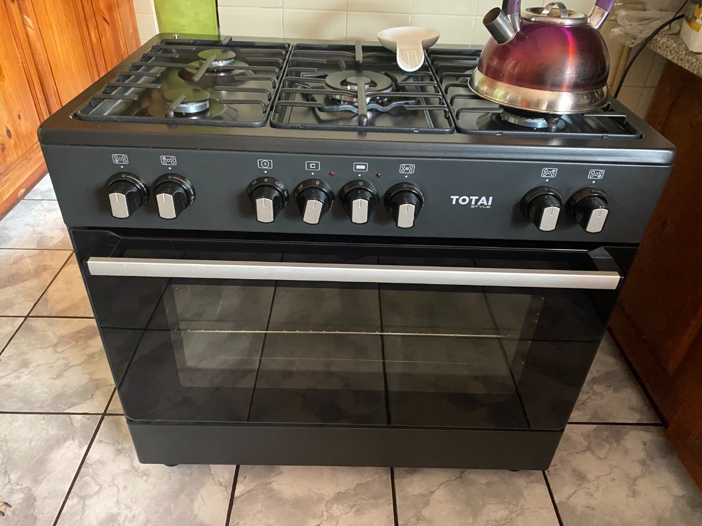 Inside, the residence provides a functional layout with one lounge and a dedicated dining room, ideal for family living and entertaining. The kitchen is equipped with a modern black gas range, boasting a five-burner stovetop and integrated oven, complemented by a double stainless steel sink and tiled backsplash. While the wooden cabinetry presents a traditional aesthetic, the space remains highly functional for daily culinary needs.