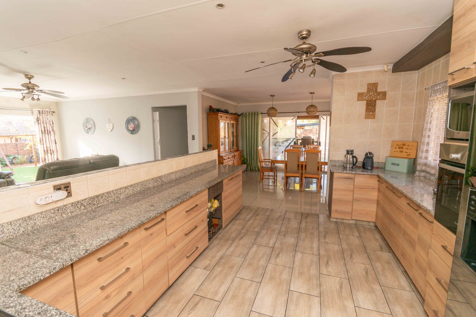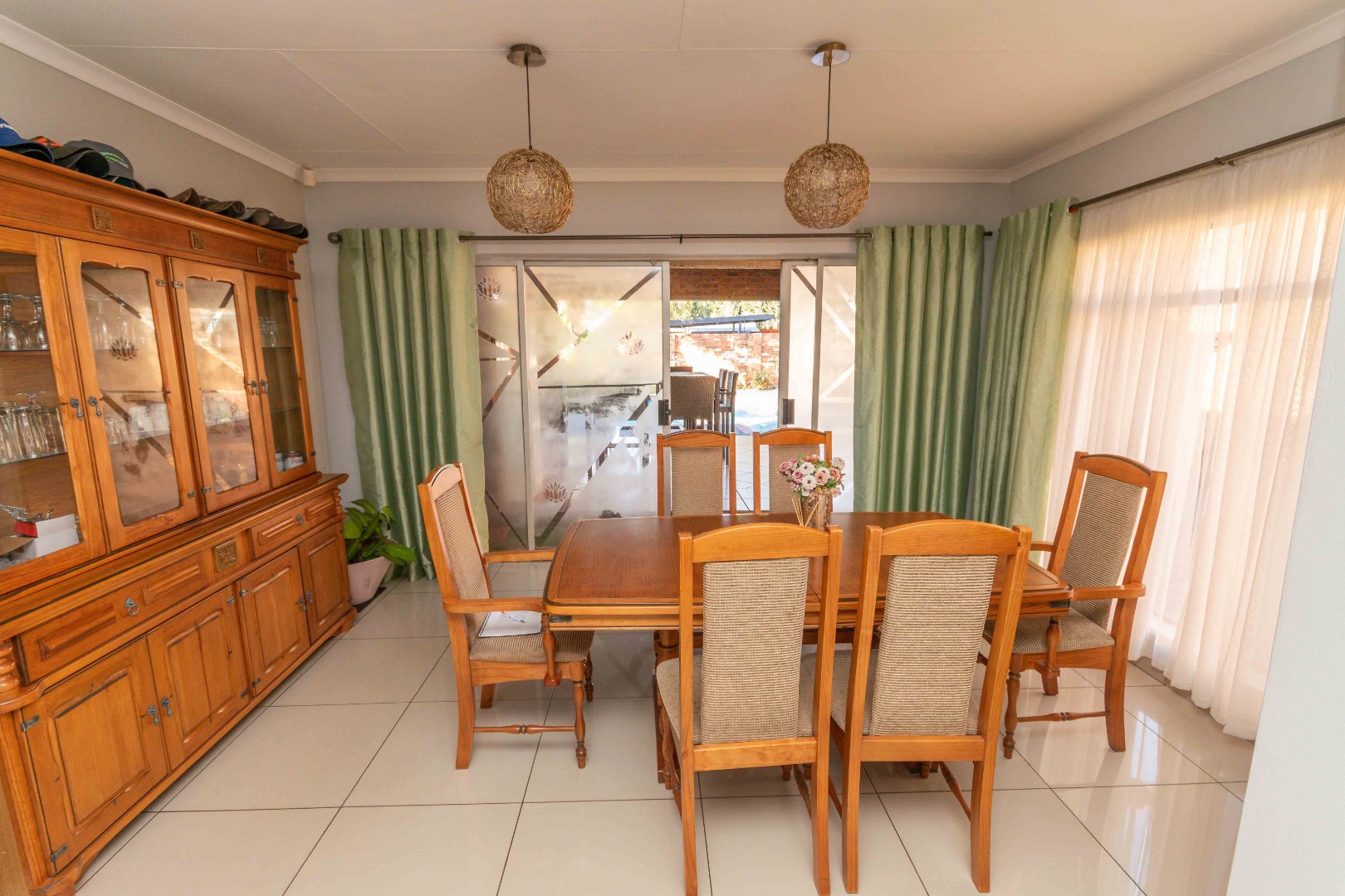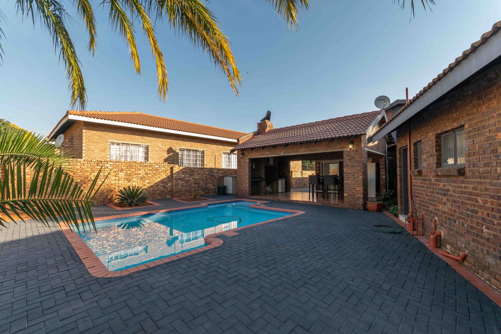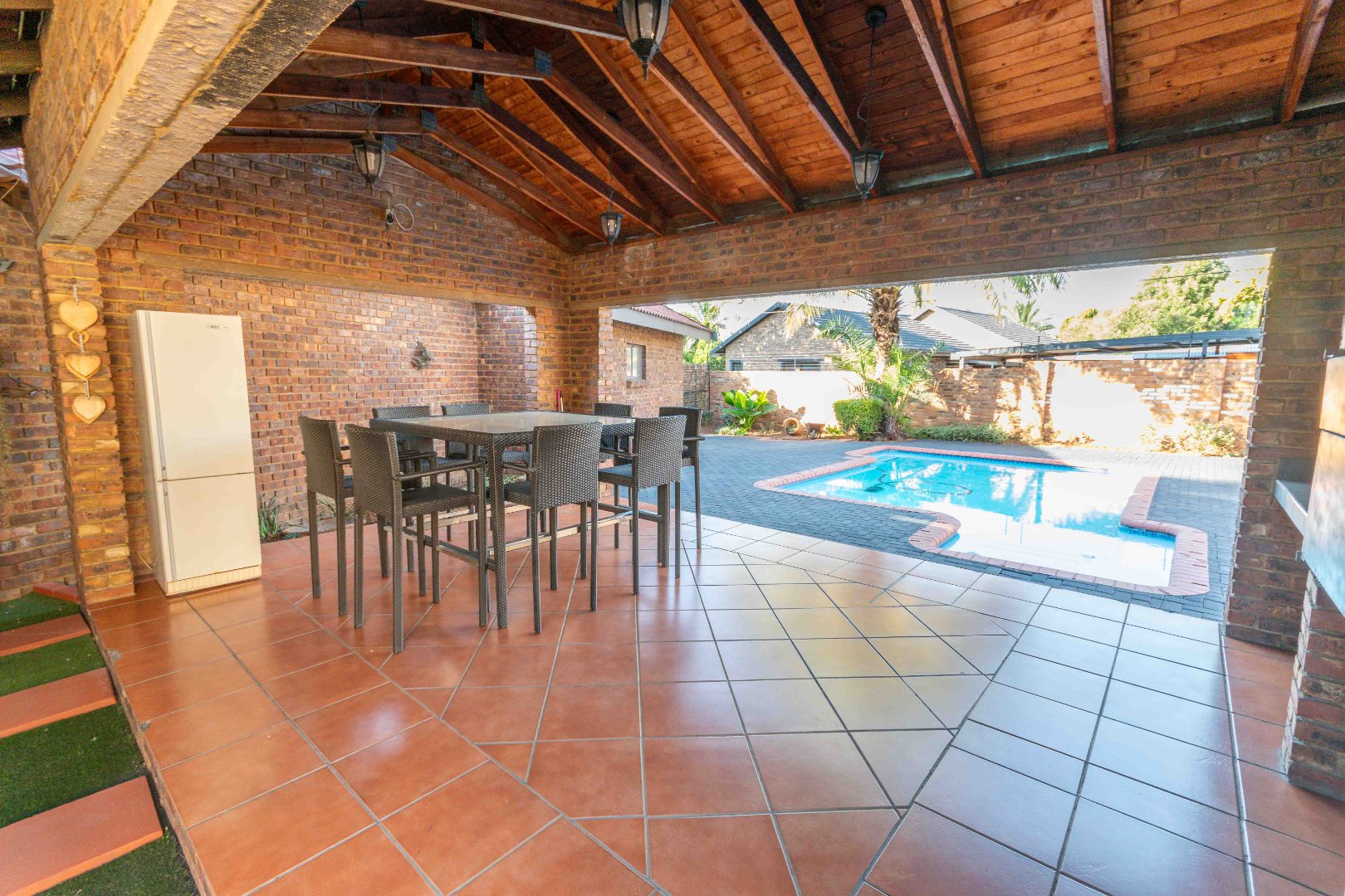 - Dining area opens to a covered patio with built-in braai, overlooking a sparkling swimming pool – ideal for indoor-outdoor living