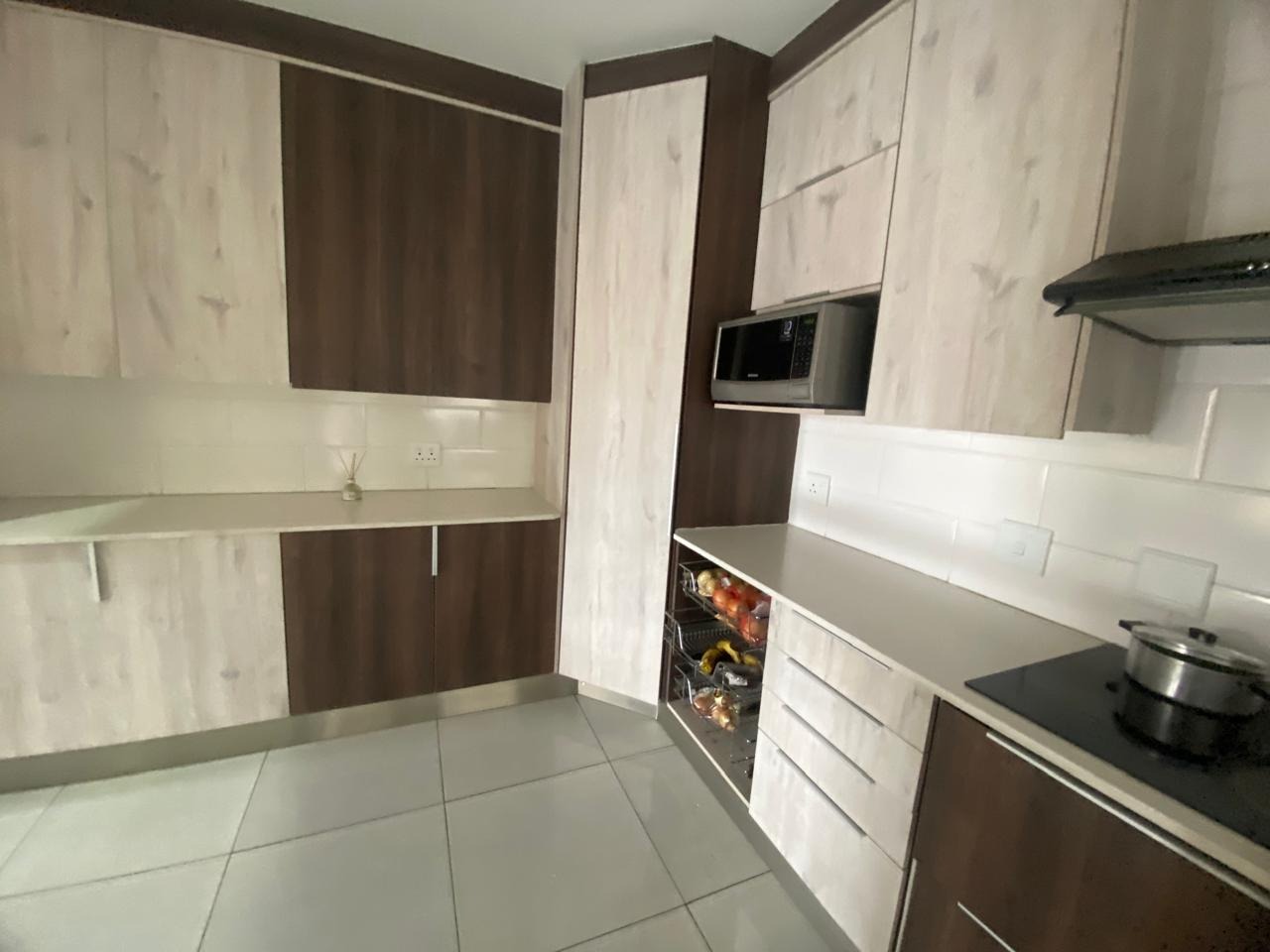 Step inside to a thoughtfully designed interior featuring a comfortable lounge and a dedicated dining room, perfect for family gatherings and entertaining. The heart of this home is its modern kitchen, boasting stylish two-toned cabinetry in dark and light wood grain. White countertops, a pristine white subway tile backsplash, and clean tiled flooring create a contemporary aesthetic. Equipped with integrated appliances including an oven, microwave, hob, and extractor fan, the kitchen offers both functionality and ample storage, making meal preparation a delight.