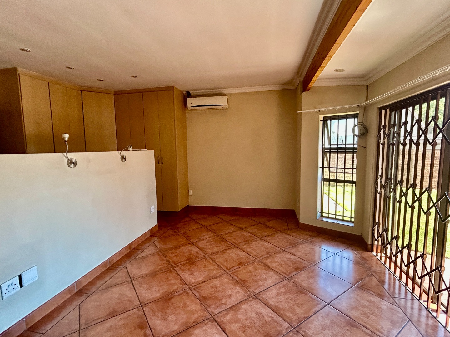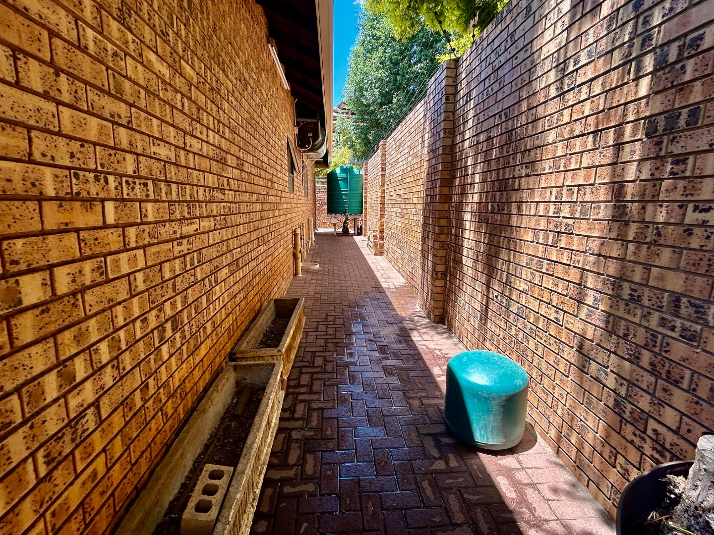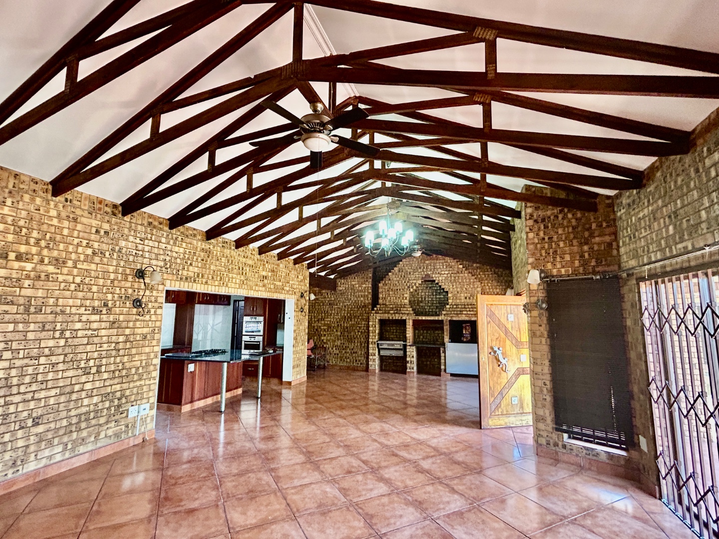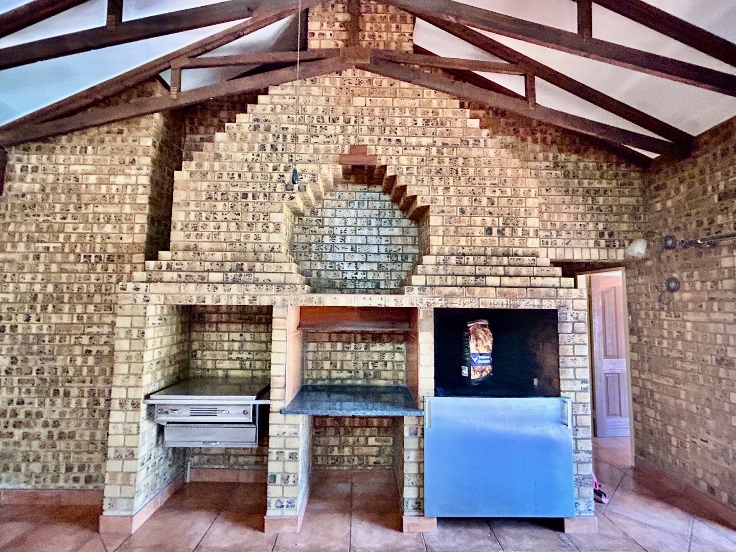 Outdoor spaces are designed for enjoyment, featuring an extensive paved courtyard, a private swimming pool, and a lush garden with a patio. A dedicated braai room with a built-in braai is ideal for year-round gatherings. Parking is abundant with three garages and four additional spaces. Security is paramount with security gates, burglar bars, electric fencing, and a totally walled perimeter. Modern conveniences include air conditioning, fibre connectivity, and water tanks.