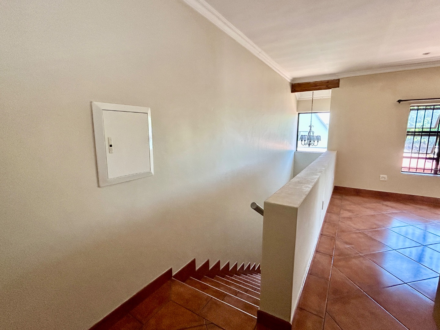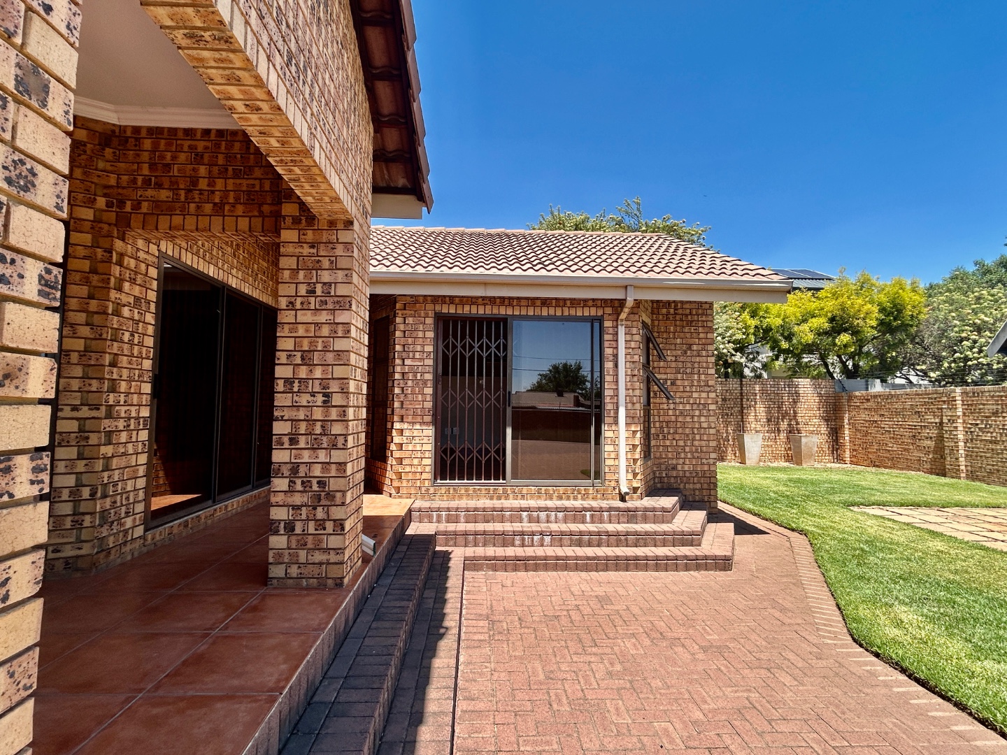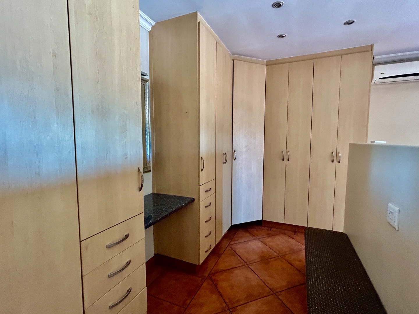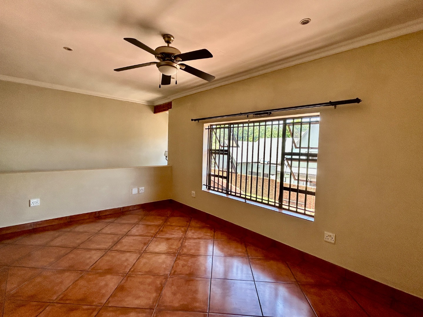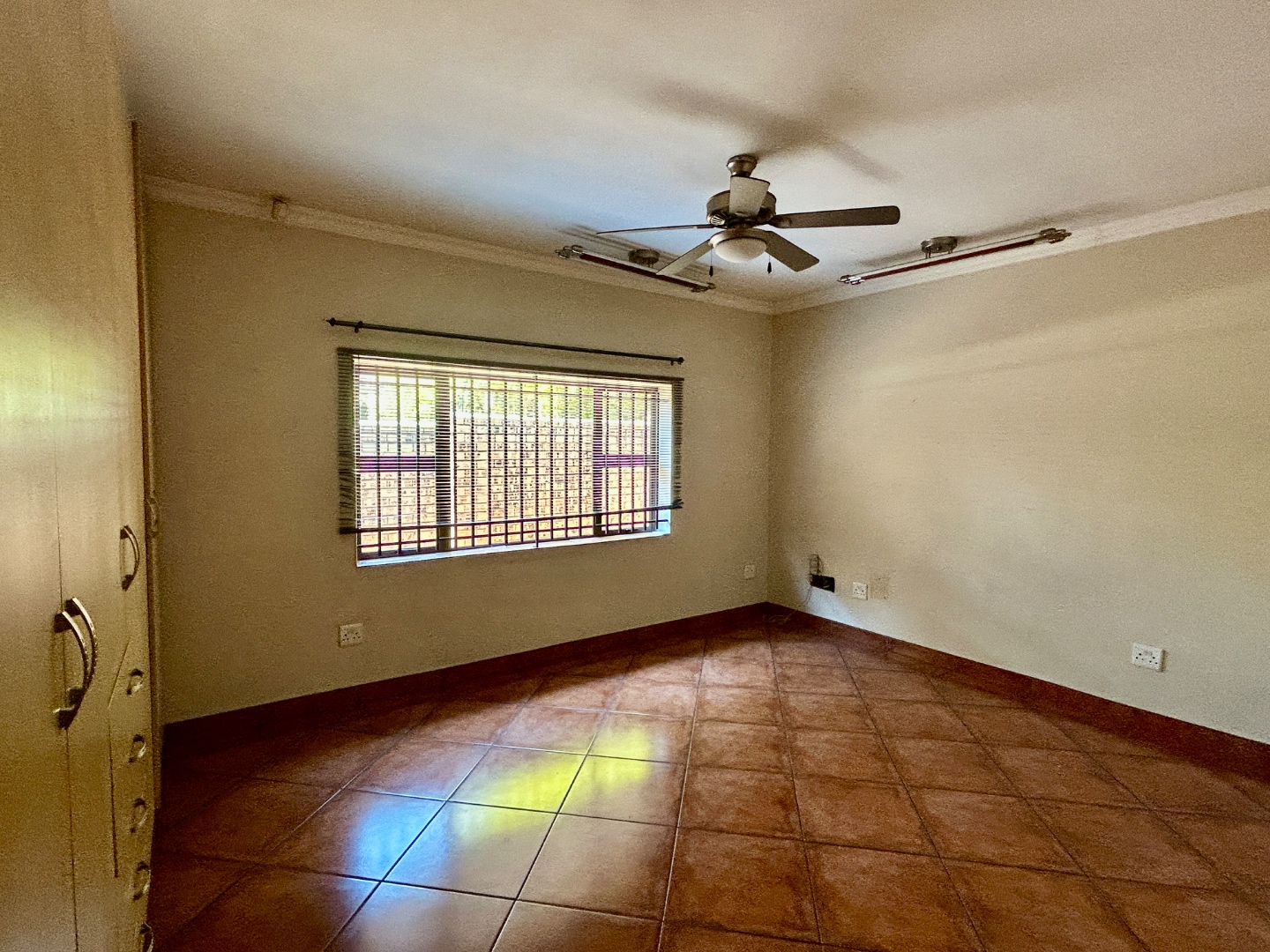 Outdoor spaces are designed for enjoyment, featuring an extensive paved courtyard, a private swimming pool, and a lush garden with a patio. A dedicated braai room with a built-in braai is ideal for year-round gatherings. Parking is abundant with three garages and four additional spaces. Security is paramount with security gates, burglar bars, electric fencing, and a totally walled perimeter. Modern conveniences include air conditioning, fibre connectivity, and water tanks.