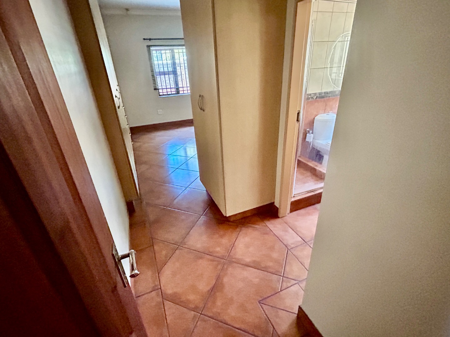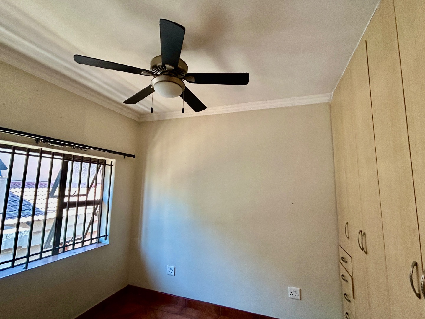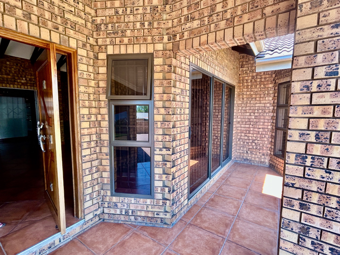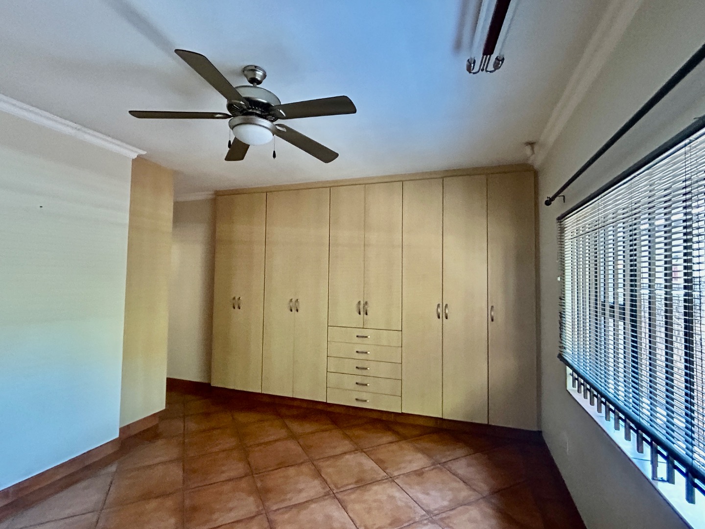 Outdoor spaces are designed for enjoyment, featuring an extensive paved courtyard, a private swimming pool, and a lush garden with a patio. A dedicated braai room with a built-in braai is ideal for year-round gatherings. Parking is abundant with three garages and four additional spaces. Security is paramount with security gates, burglar bars, electric fencing, and a totally walled perimeter. Modern conveniences include air conditioning, fibre connectivity, and water tanks.