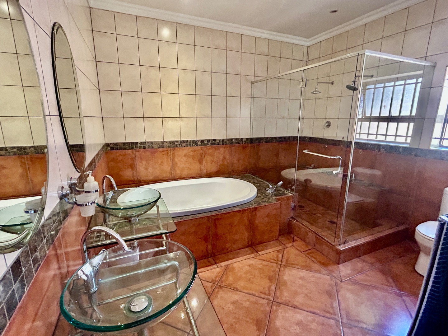 Inside, discover a thoughtfully laid-out interior featuring two spacious lounges, a dedicated dining room, and two well-appointed kitchens, catering to the dual living arrangement. Architectural highlights include high vaulted ceilings with exposed wooden beams and durable tiled flooring throughout, creating an inviting open-plan atmosphere. Four generously sized bedrooms, each with an en-suite bathroom, total 4.5 bathrooms. Ample built-in storage and integrated vanity areas enhance practicality, while bathrooms boast modern dual glass vessel sinks, large built-in soaking tubs, and spacious glass-enclosed showers.