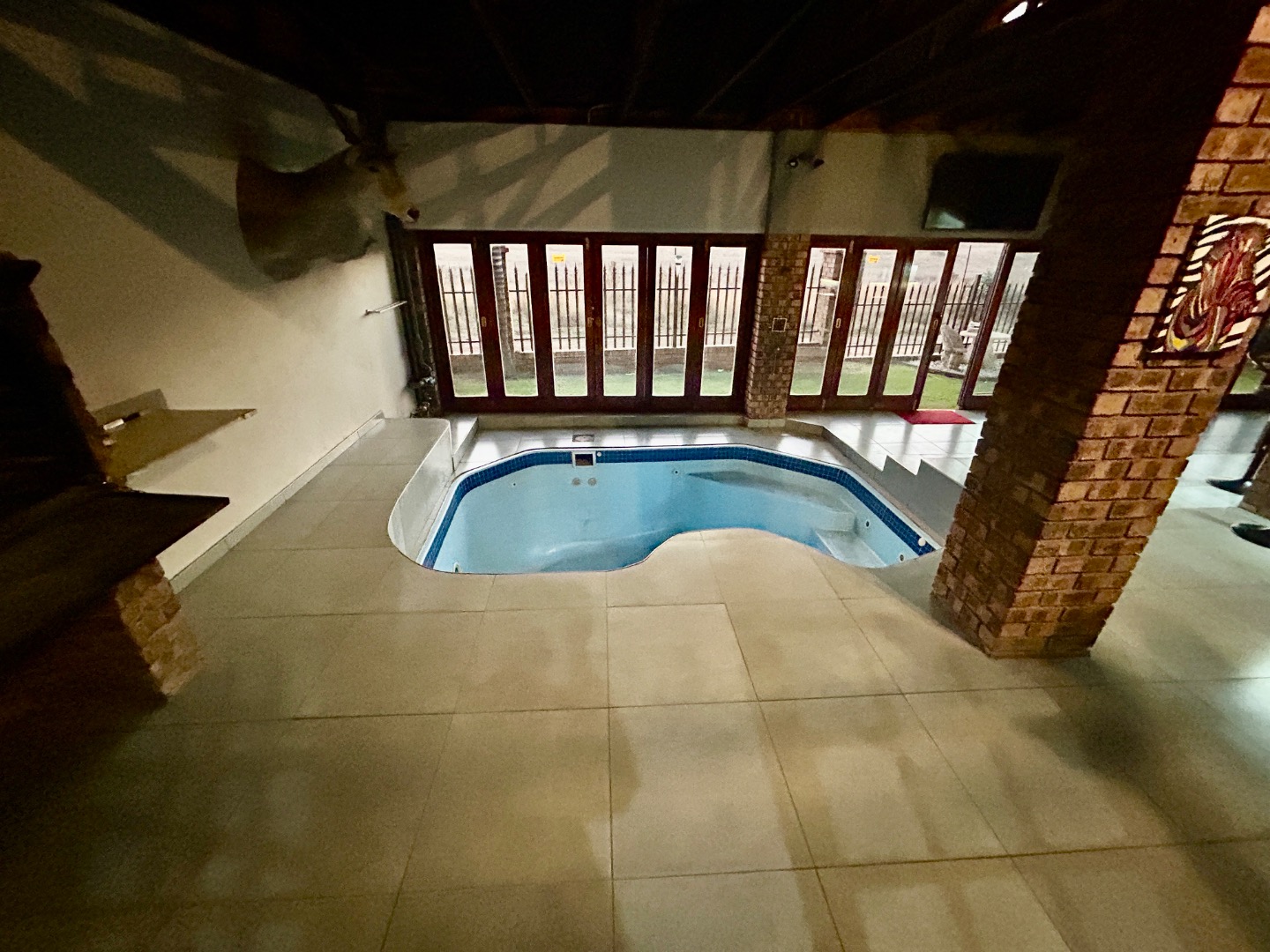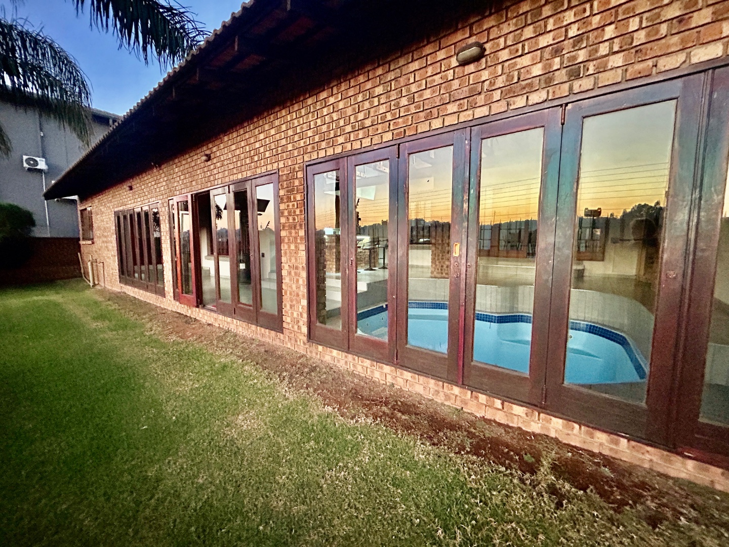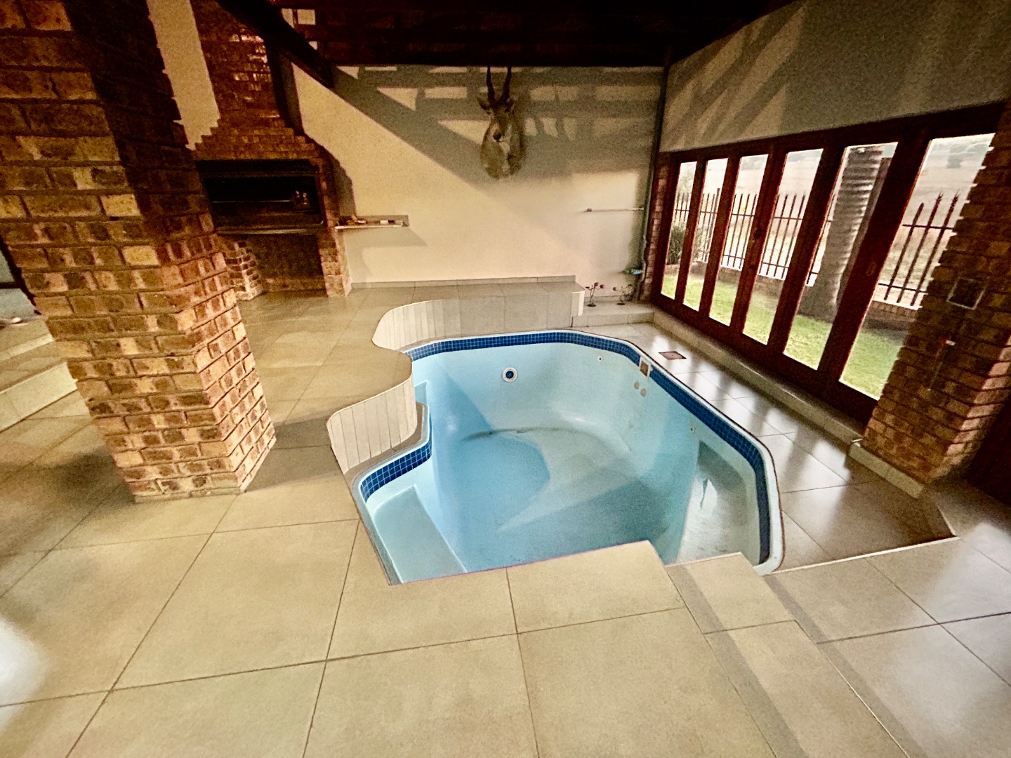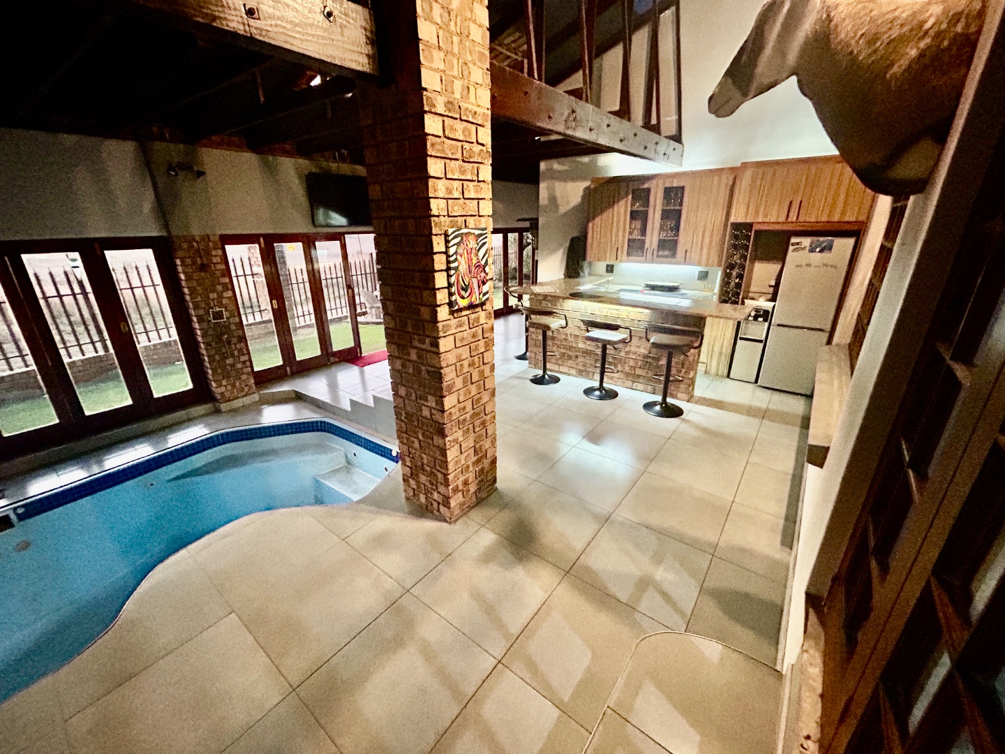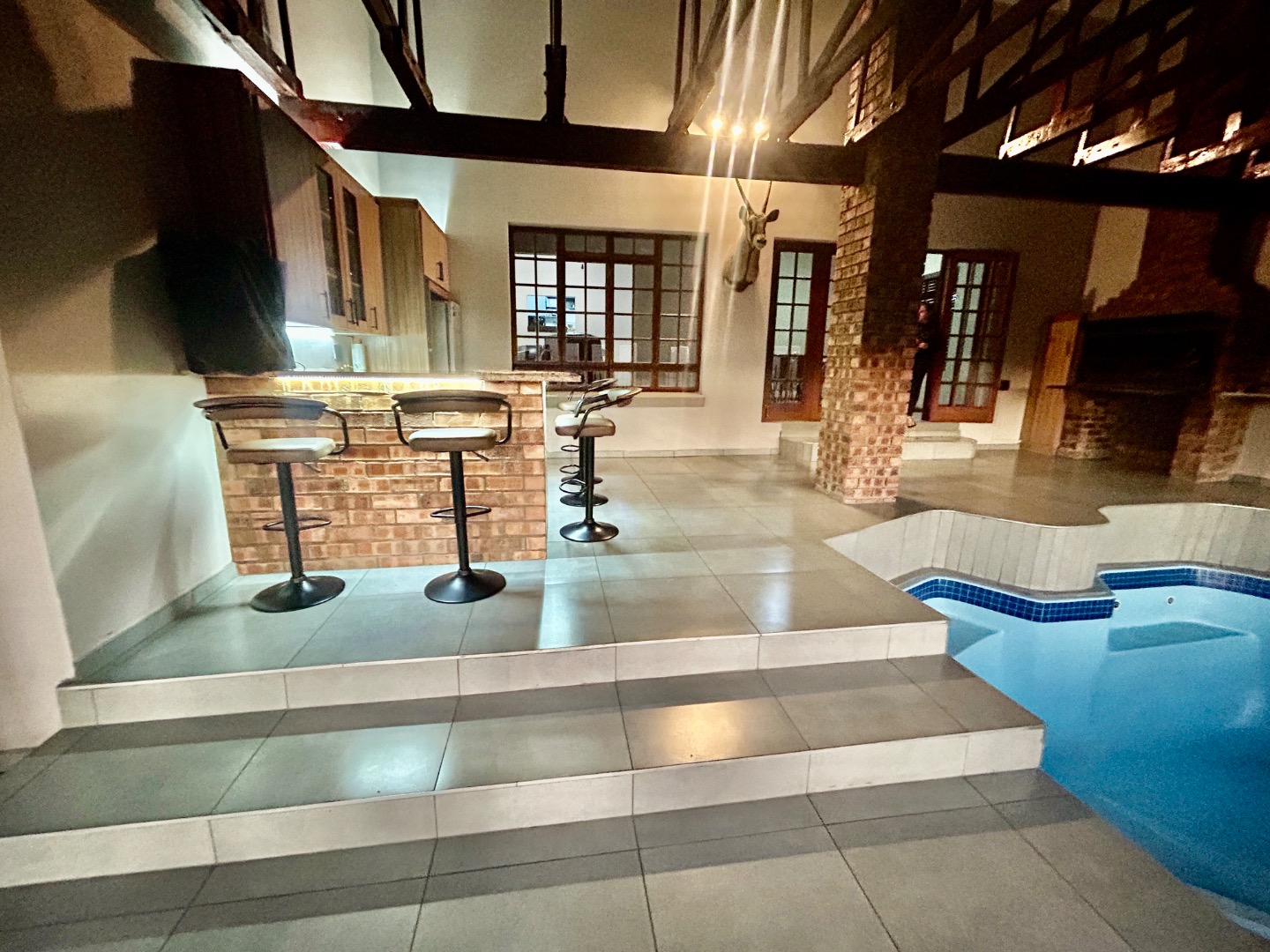 The entertainment area with warm pool, braai and bar are covered with glass folding doors.