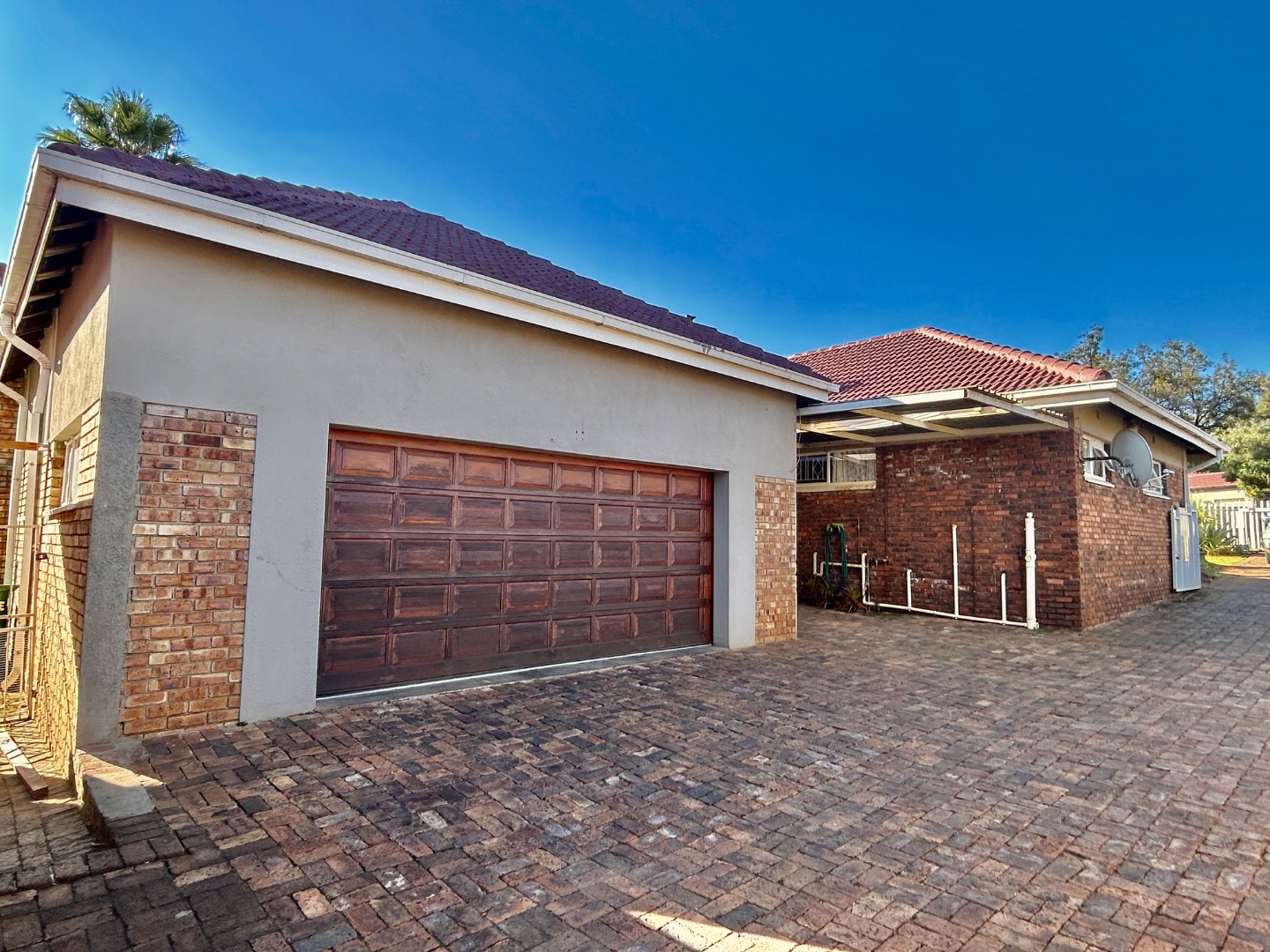 The inviting exterior features a charming rustic wooden door, a well-maintained front lawn secured by a white palisade fence, and mature landscaping. A large paved driveway leads to two garages, providing ample parking and storage. The property's kerb appeal is enhanced by its red tiled roof and tasteful brick accents.