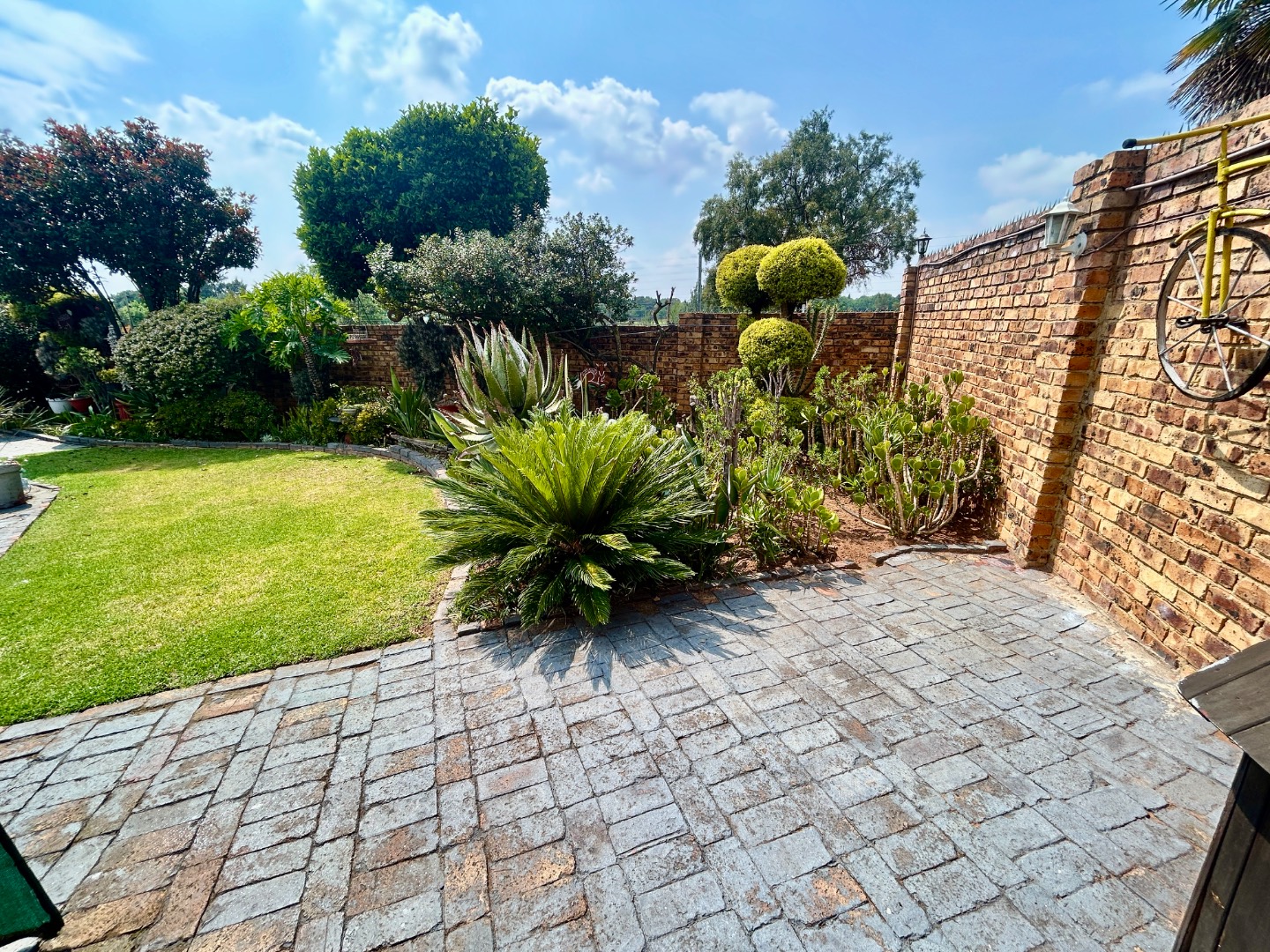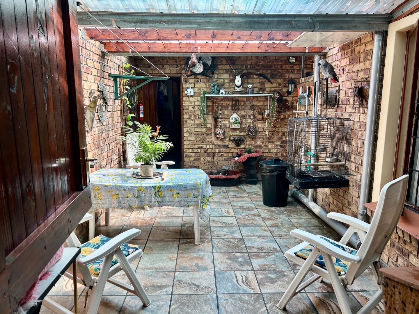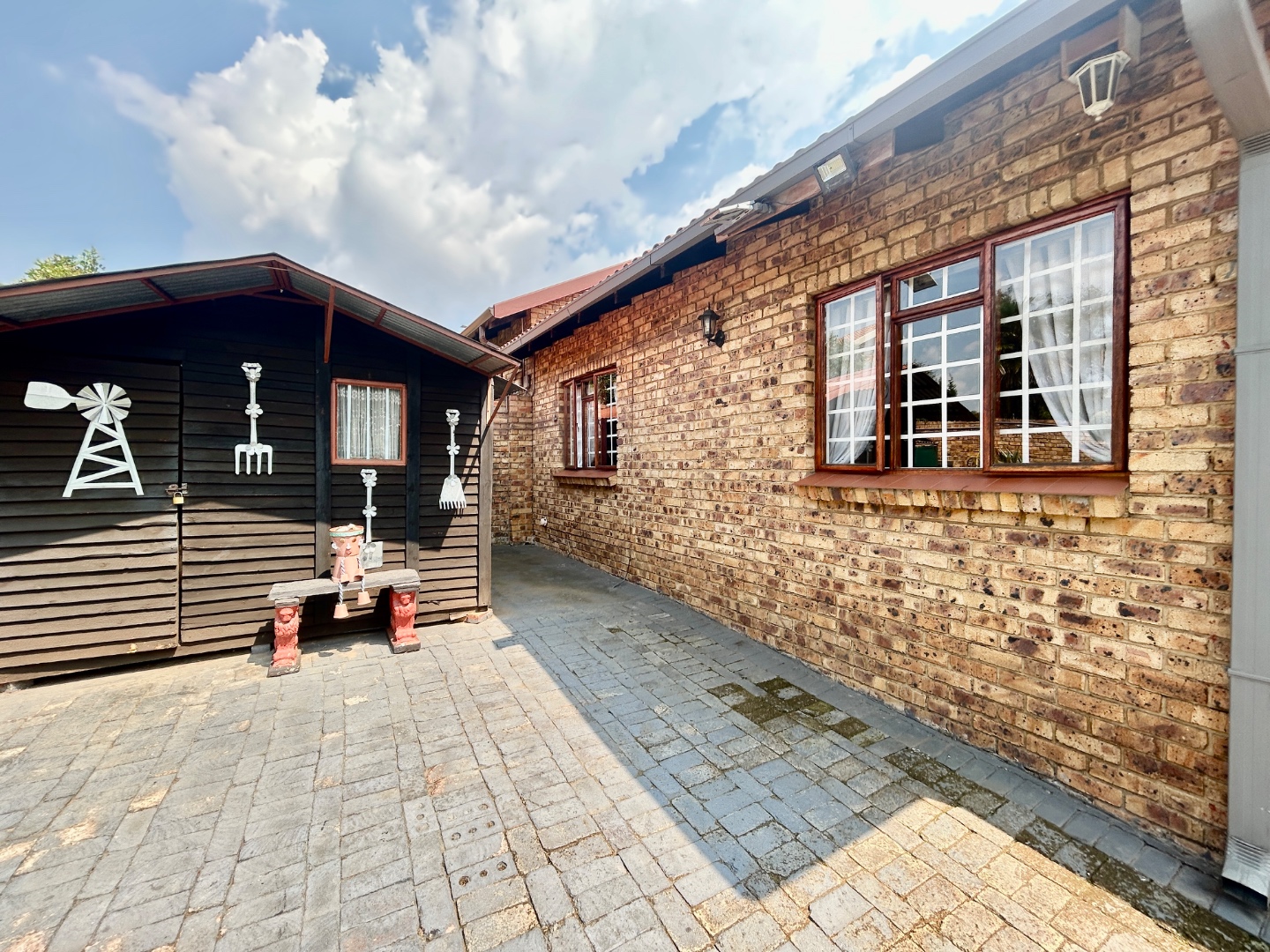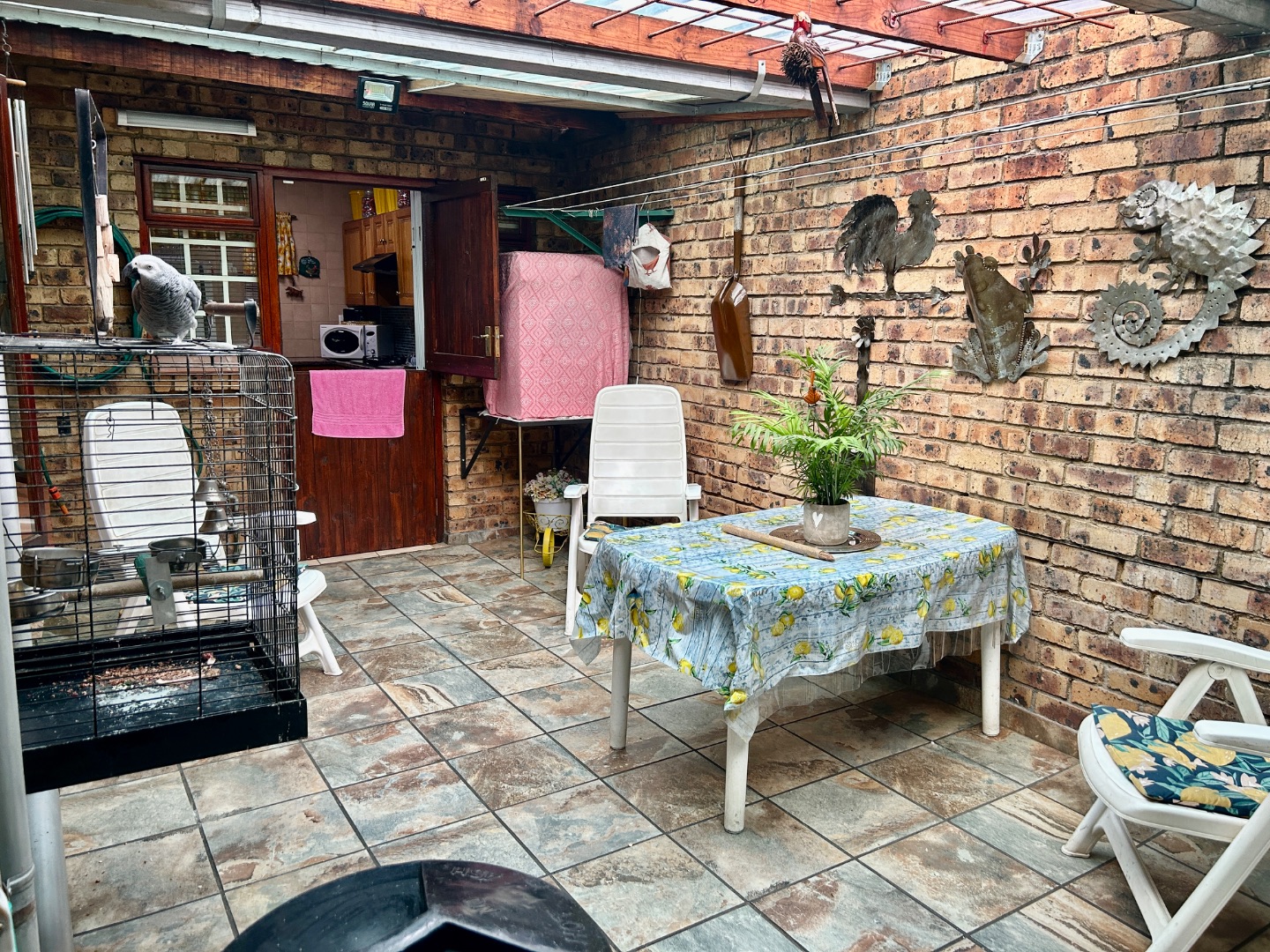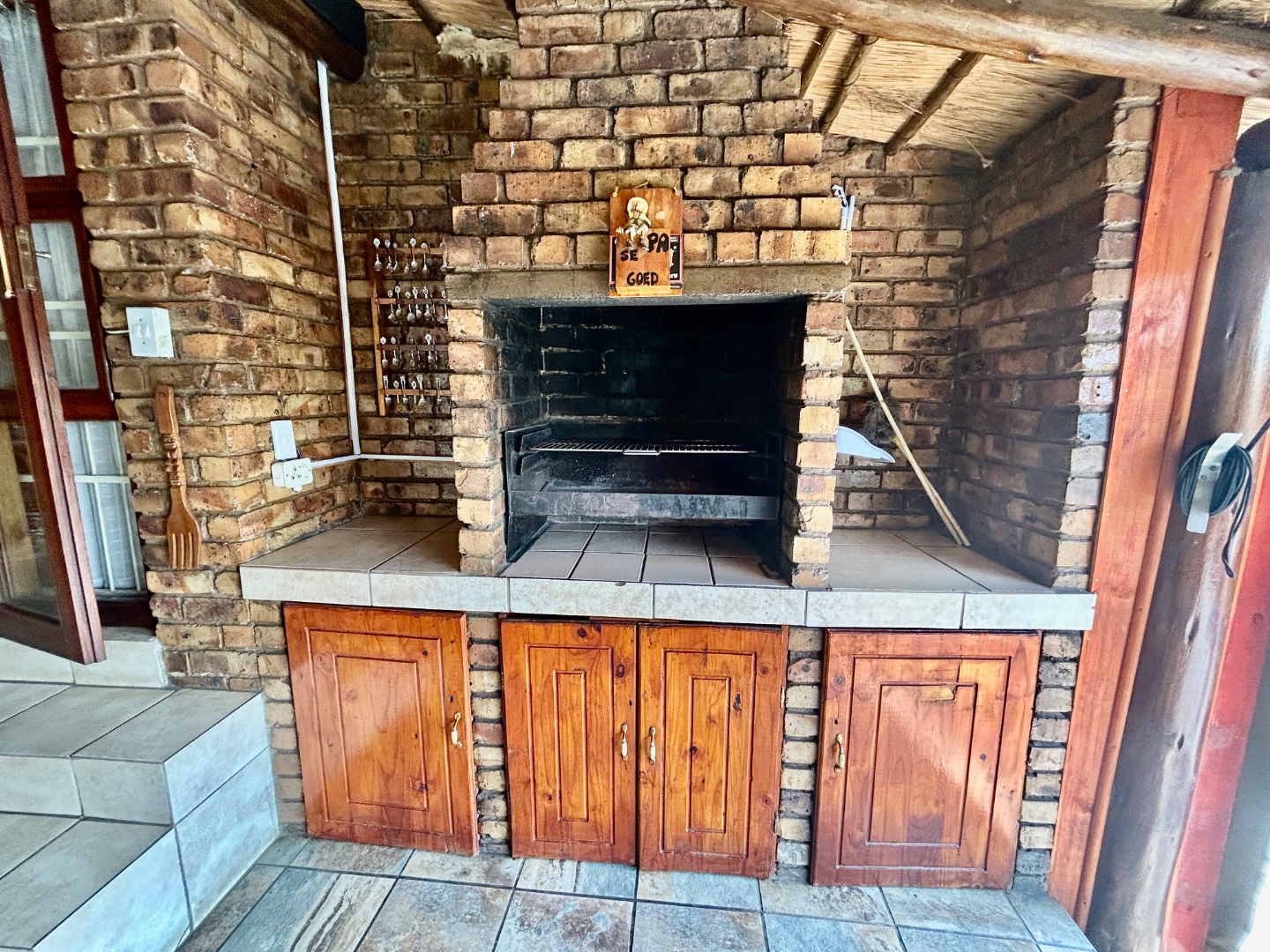 Accommodation comprises three bedrooms, with the main featuring an en-suite bathroom. Outdoor living with a lapa, a garden with an irrigation system, and a paved patio. Sliding doors connect to a dedicated braai room, ideal for entertaining. Practical amenities include a laundry room, storage - wendy house, two garages, and two additional parking spaces. Pets are allowed within the totally walled perimeter.