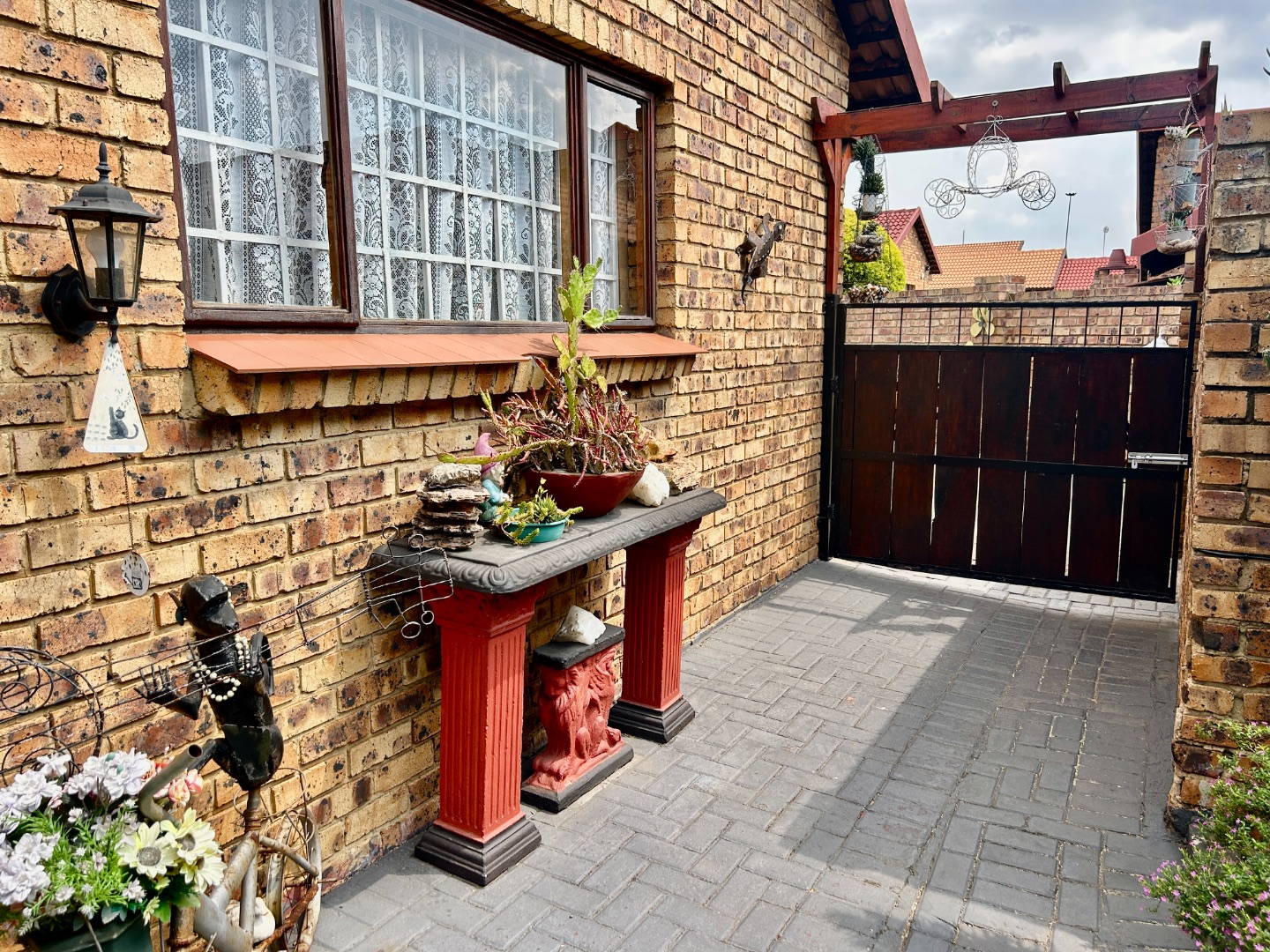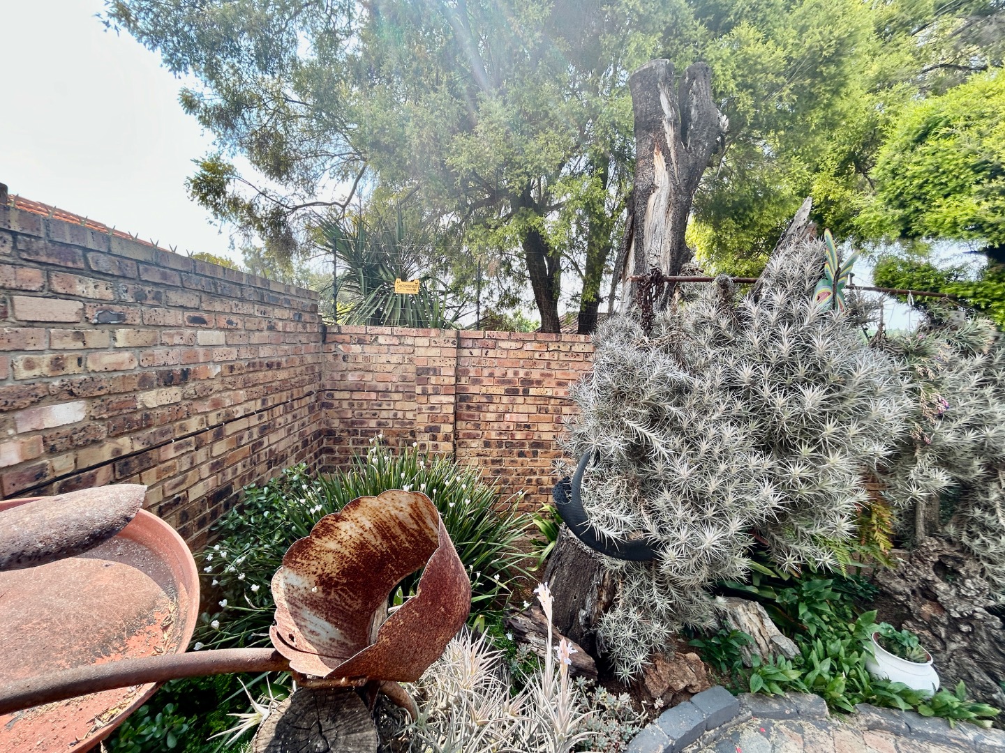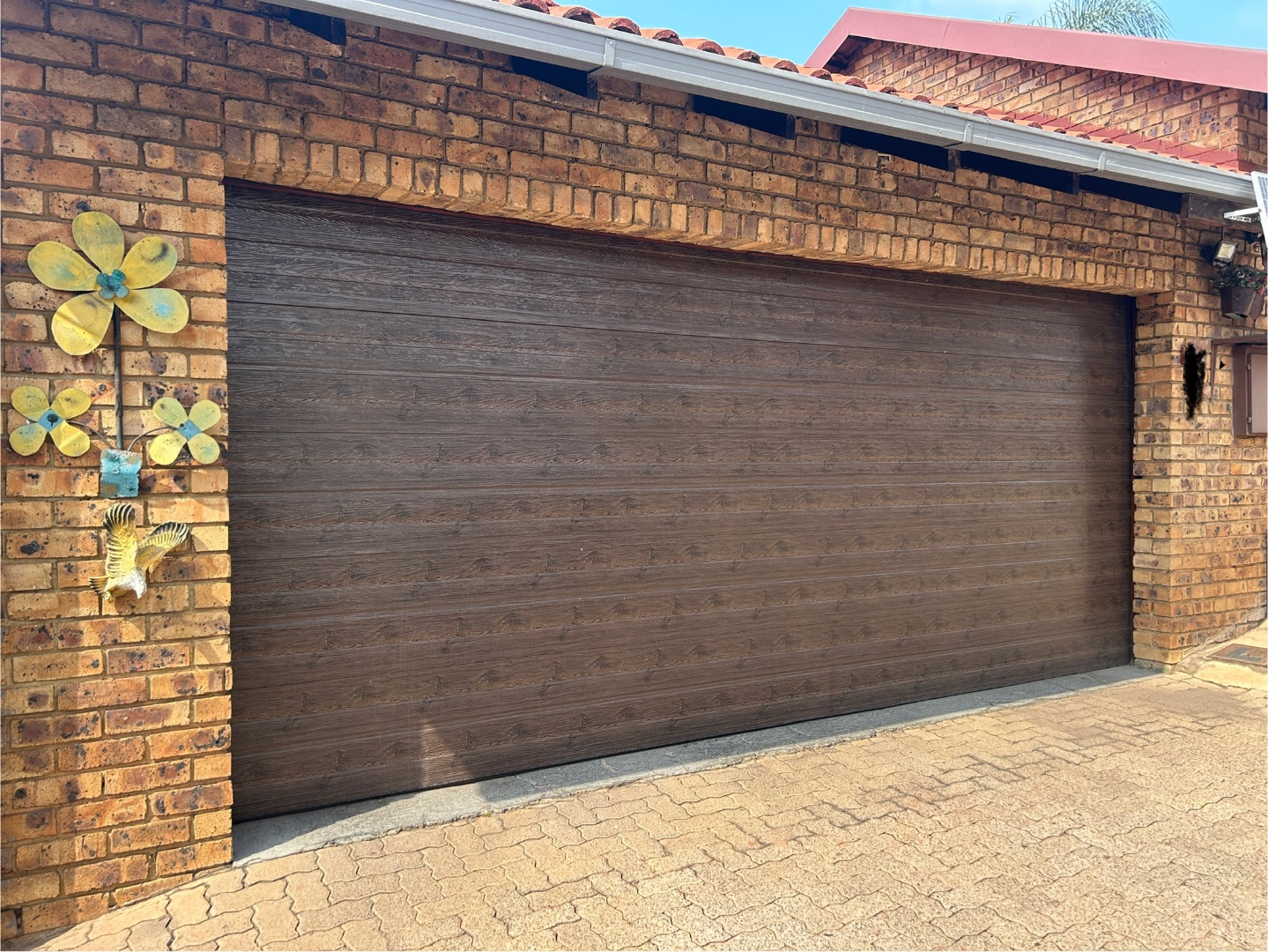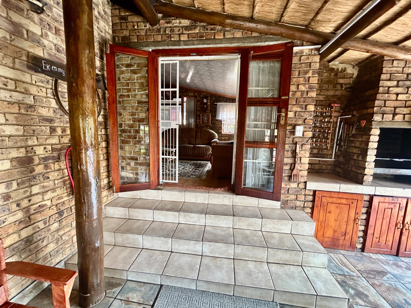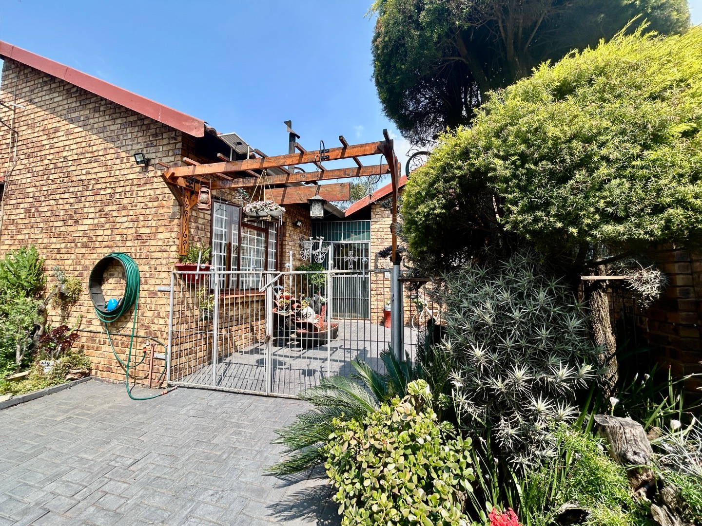 Accommodation comprises three bedrooms, with the main featuring an en-suite bathroom. Outdoor living with a lapa, a garden with an irrigation system, and a paved patio. Sliding doors connect to a dedicated braai room, ideal for entertaining. Practical amenities include a laundry room, storage - wendy house, two garages, and two additional parking spaces. Pets are allowed within the totally walled perimeter.