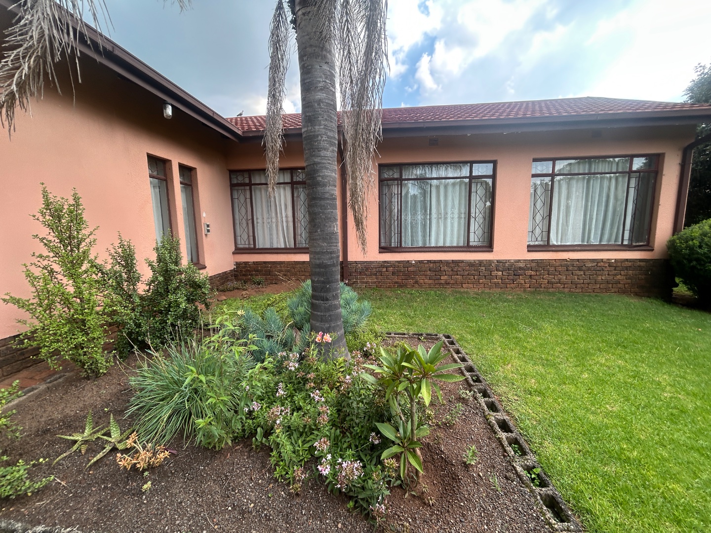 Peach-colored walls, tiled roof, and a well-maintained garden featuring a lush green lawn and established plant beds. Multiple entry points, secured with burglar bars, hint at the home's versatile layout, including a dual living potential.