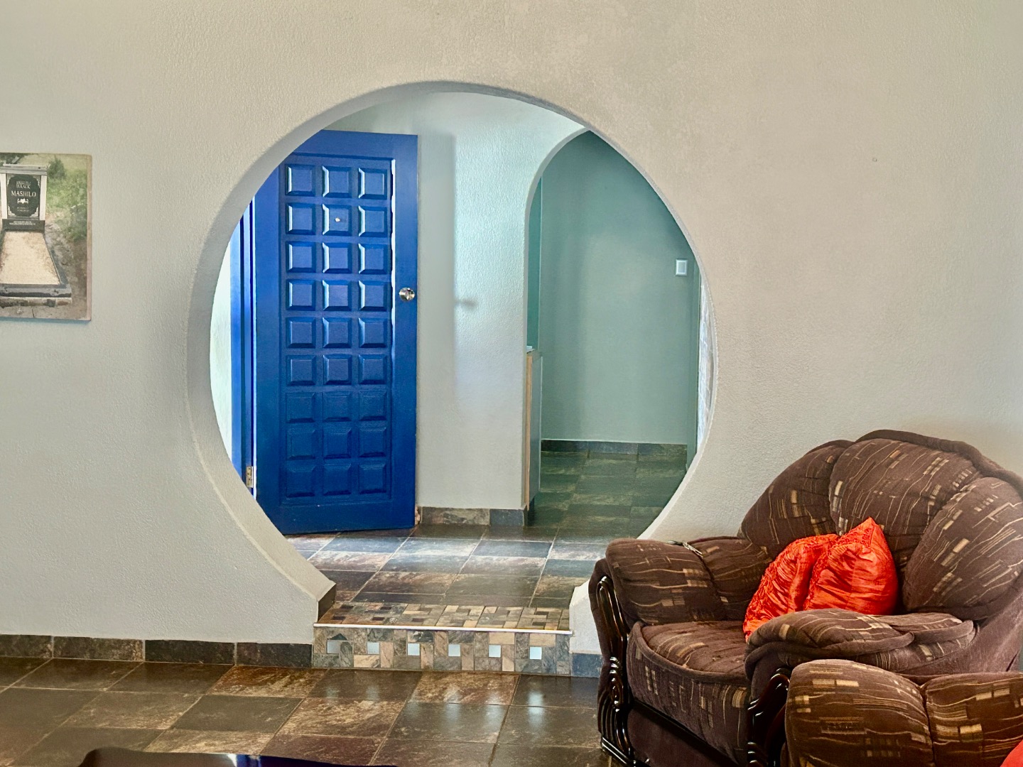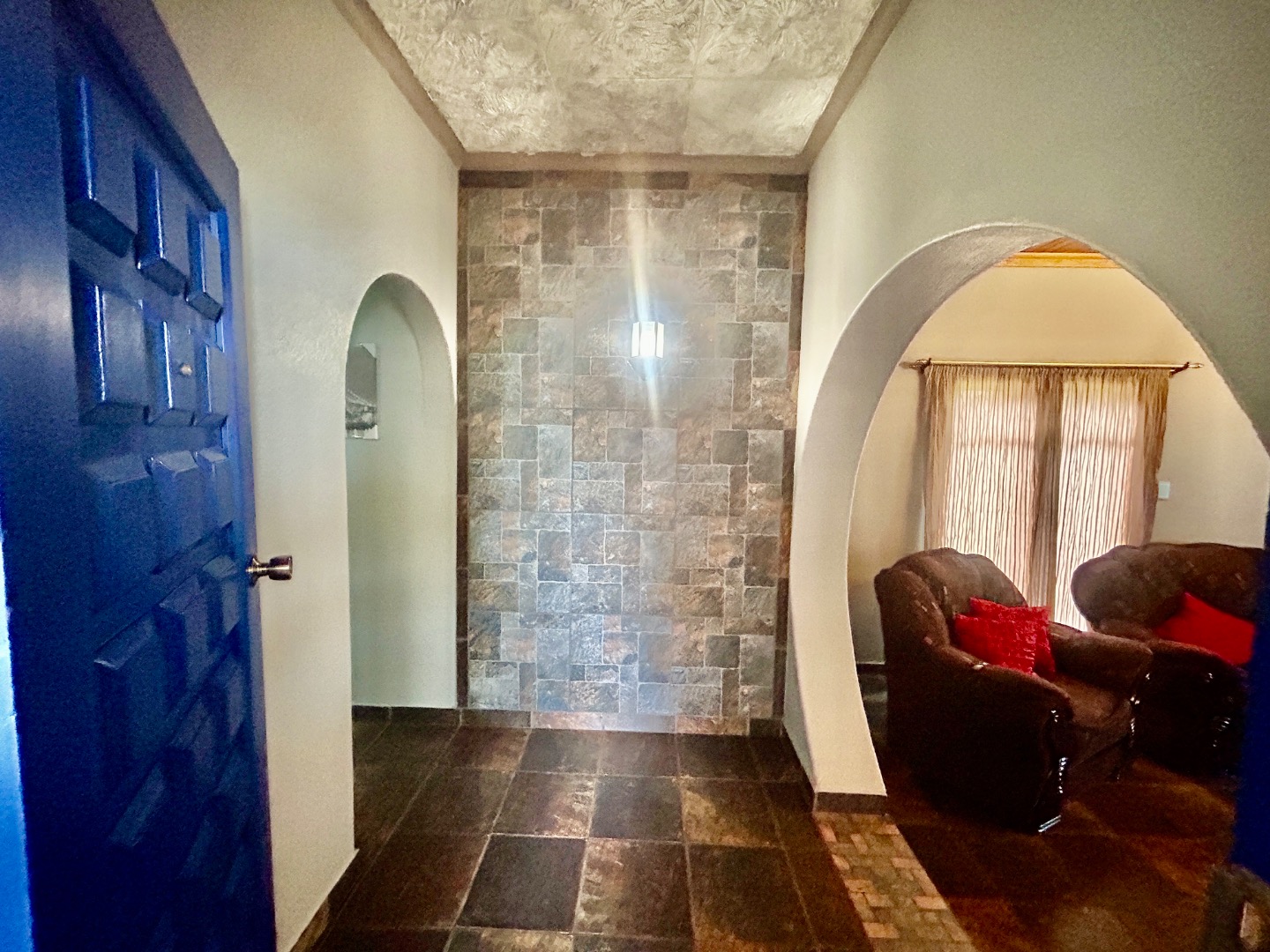 Upon entering, a bold blue paneled door leads into a hallway adorned with elegant archways and a distinctive stone-tiled accent wall, all set on durable tiled flooring. The interior boasts a spacious lounge with a warm wood-paneled ceiling and ample natural light, alongside a dedicated dining room capable of accommodating large gatherings. The functional kitchen is equipped with light wood cabinetry, a modern stainless steel fridge, a built-in oven/stove, and a double sink, complemented by a convenient pantry. Additional interior spaces include a study, a family TV room, and a reception area, offering flexible living arrangements.