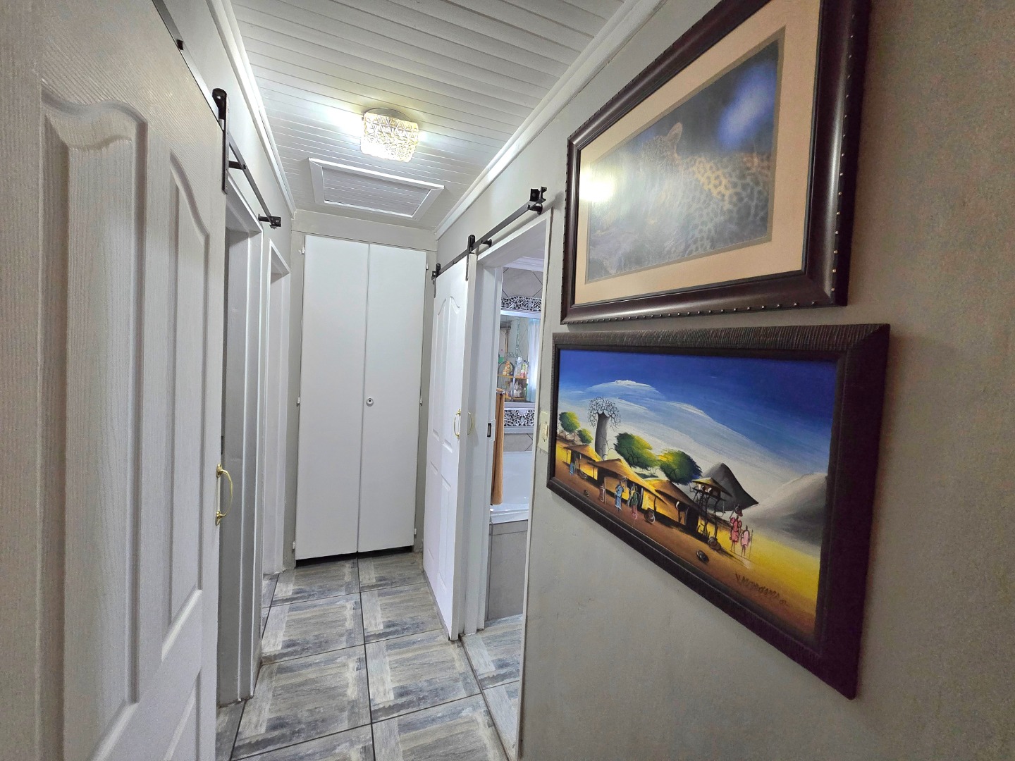 Inside, the home offers a cozy living and dining area that extends to a spacious enclosed patio, complete with a built-in braai—great for entertaining in any season. The well-appointed kitchen provides generous cupboard space and easy access to a covered outdoor laundry area, as well as an extra outside toilet for added convenience. The three bedrooms are well-sized, with one featuring newly fitted cupboards. The main bedroom boasts an en-suite bathroom with a shower, while the other two bedrooms are serviced by a beautifully updated full bathroom with a corner bath.