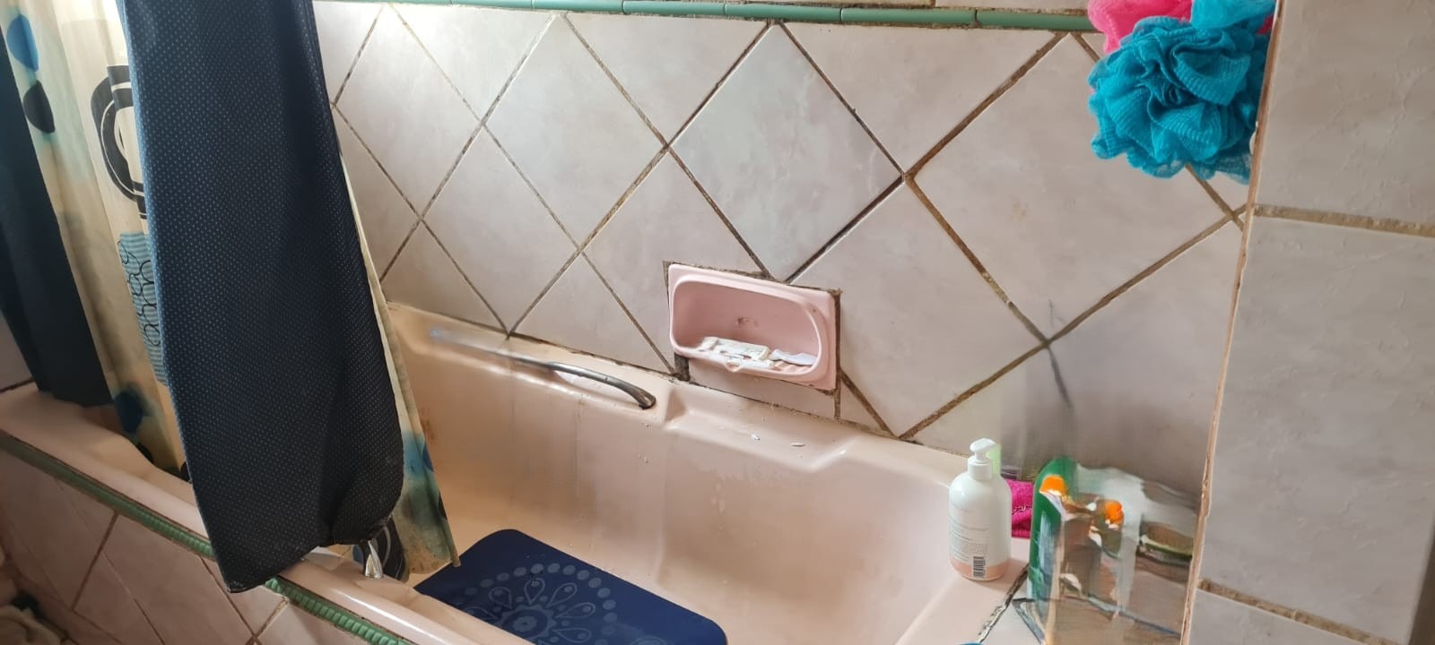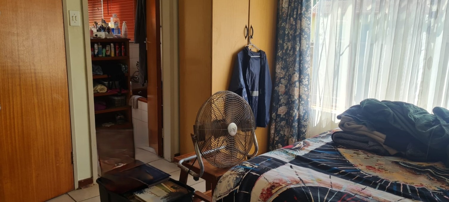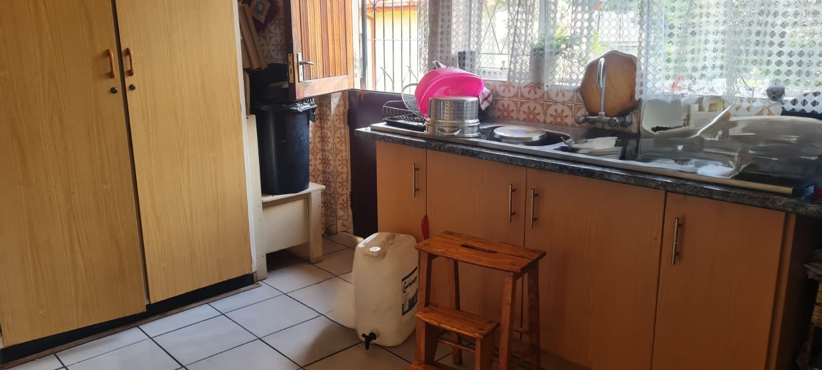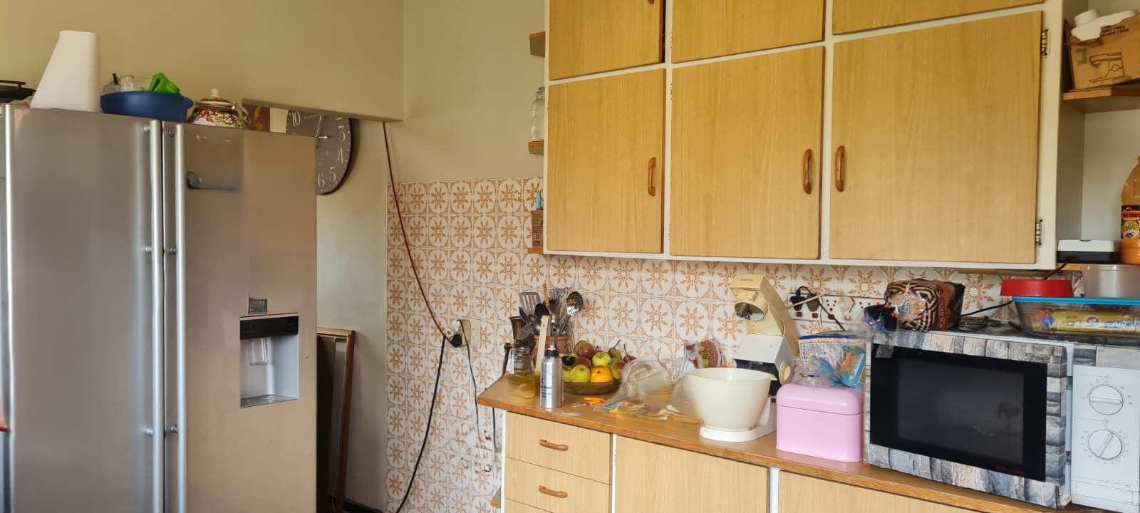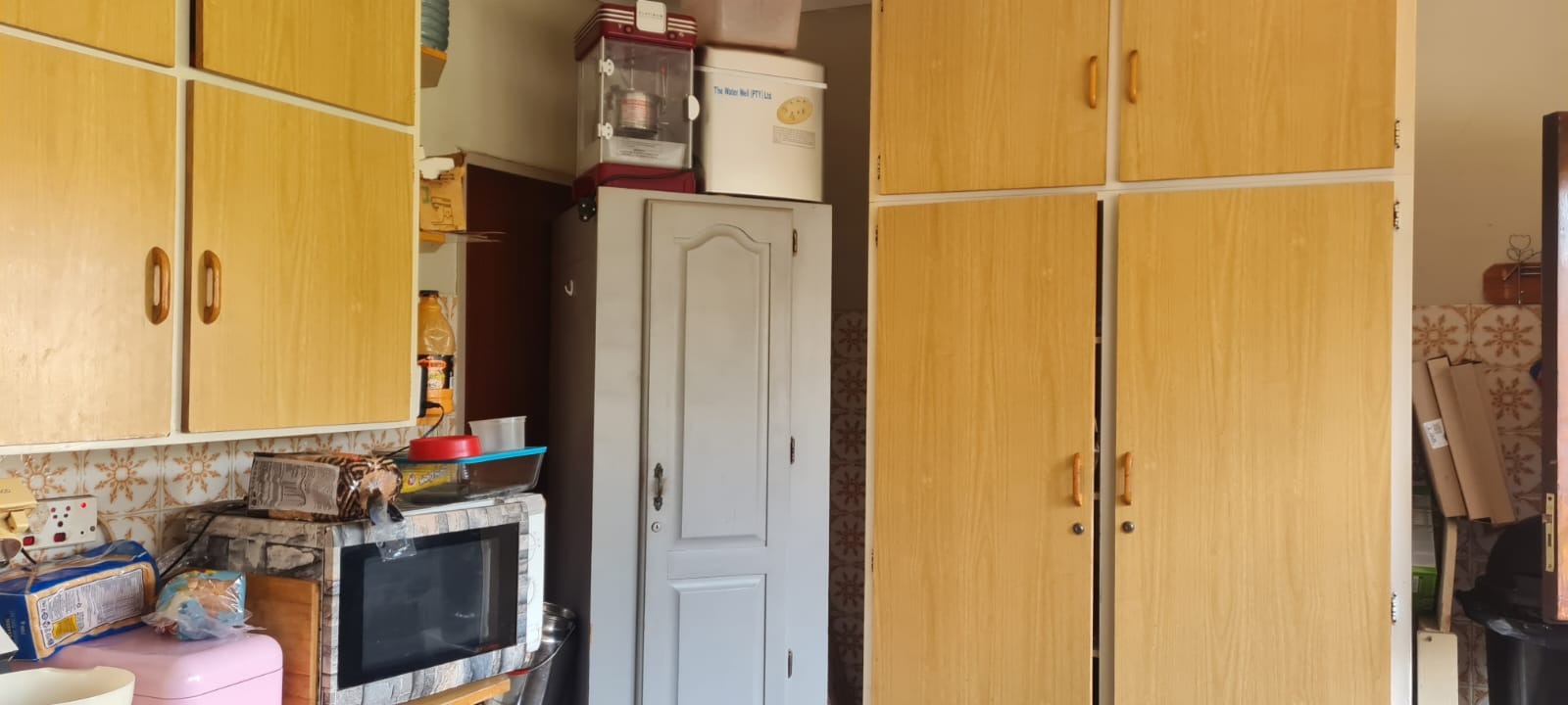 This spacious 4-bedroom, 2-bathroom residence, including one en-suite, offers comfortable living in the suburban area of Kanonkop, Middelburg. The home has a dedicated lounge and dining room, providing ample space for relaxation and entertaining. The kitchen, while presenting a dated aesthetic, boasts numerous cabinets for storage, a tiled backsplash, and accommodates a modern stainless steel side-by-side refrigerator. Good counter space is available, awaiting a tenant's personal touch to modernise. Throughout certain areas, you'll find classic parquet wood flooring and a natural wood plank ceiling, adding character to the interior.